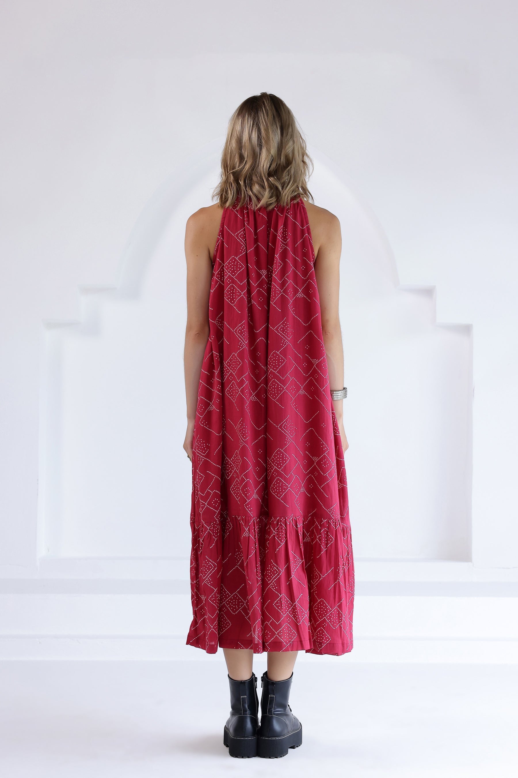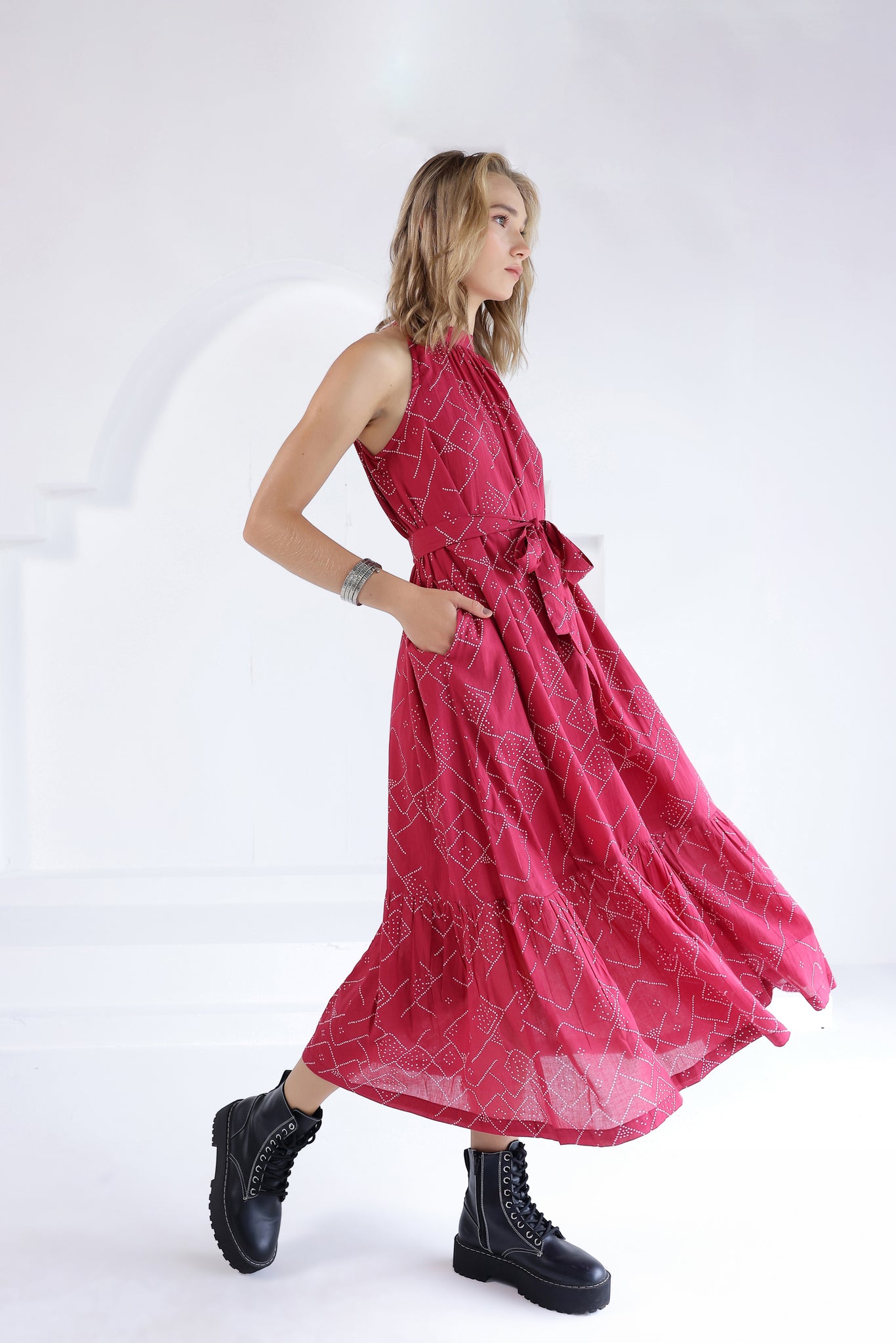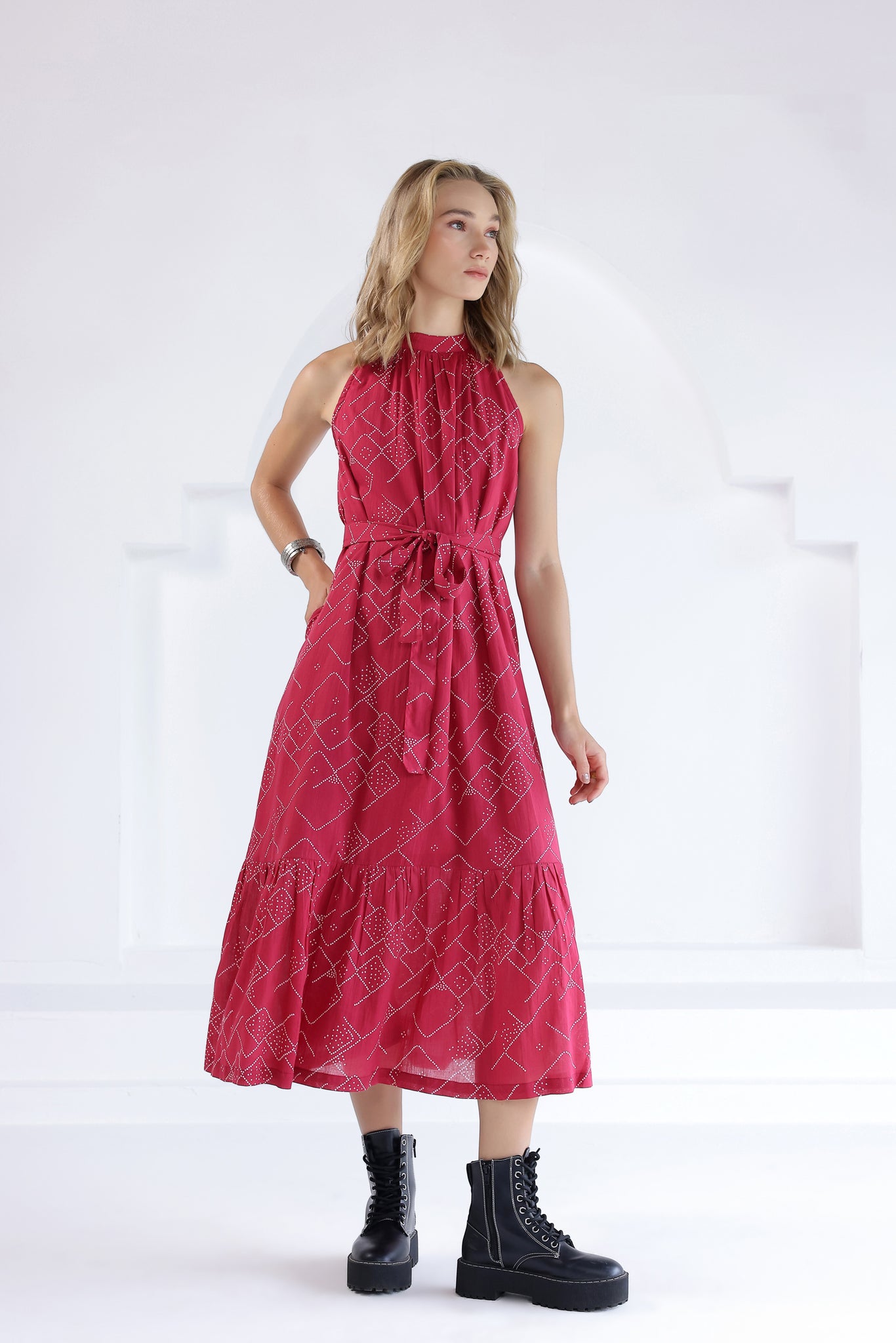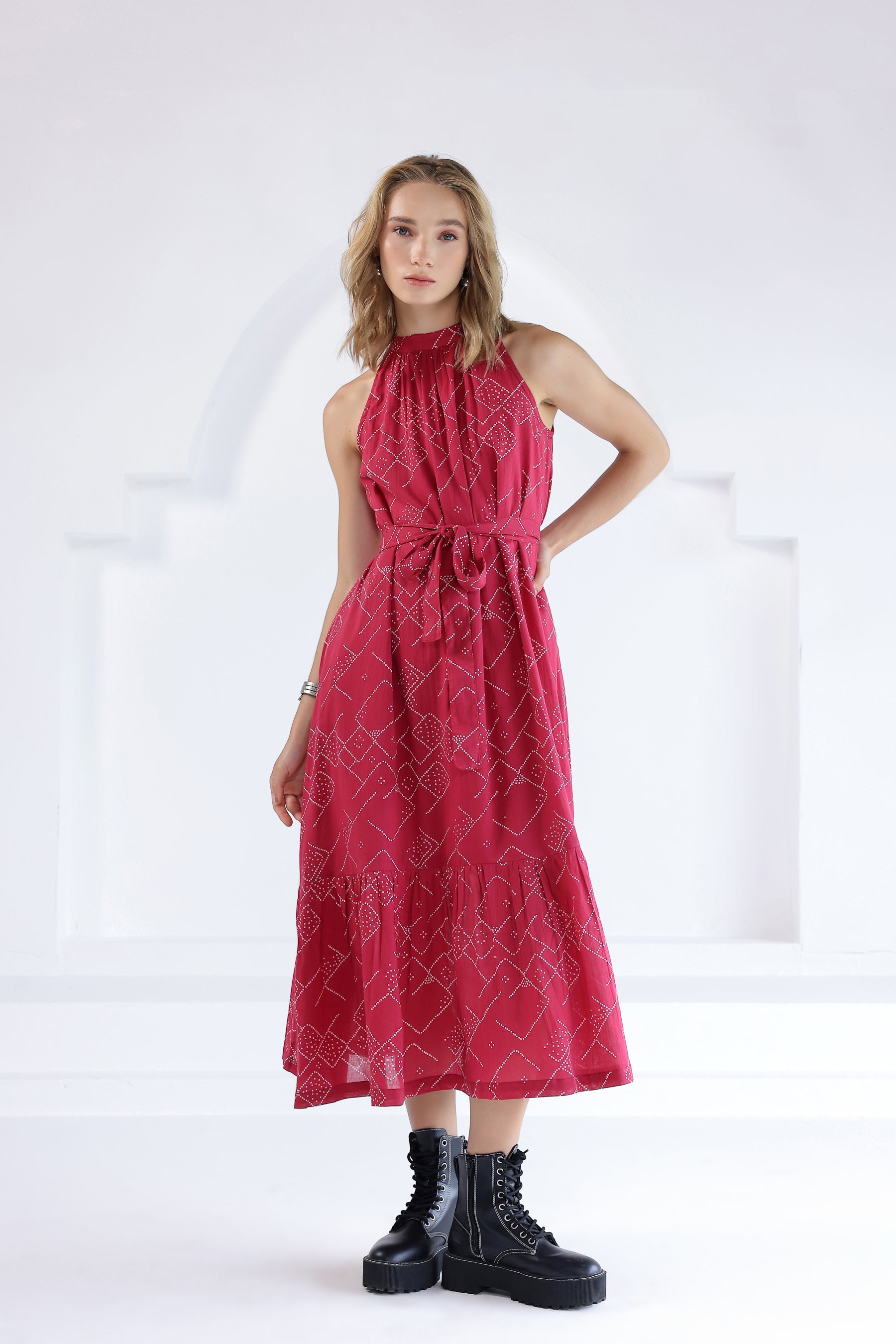 Bandhani printed long tiered sleeveless dress in cotton fabric with a round gathered neckline and button closure at the back. Comes with a detachable belt.