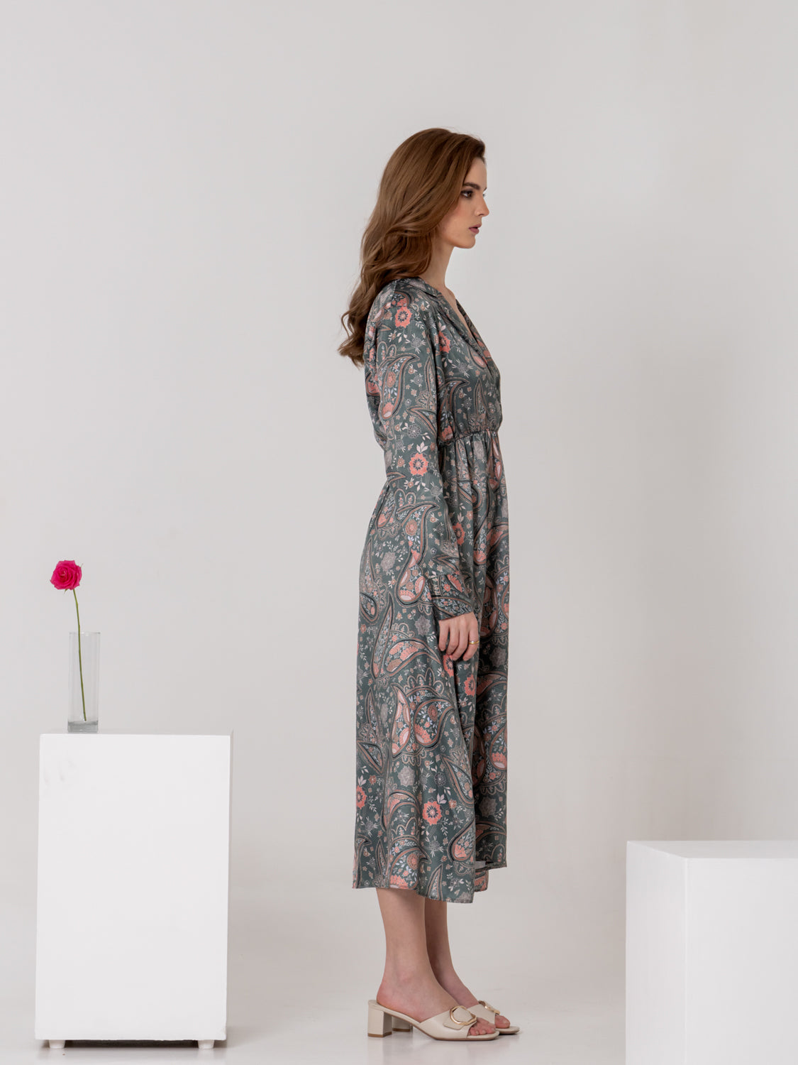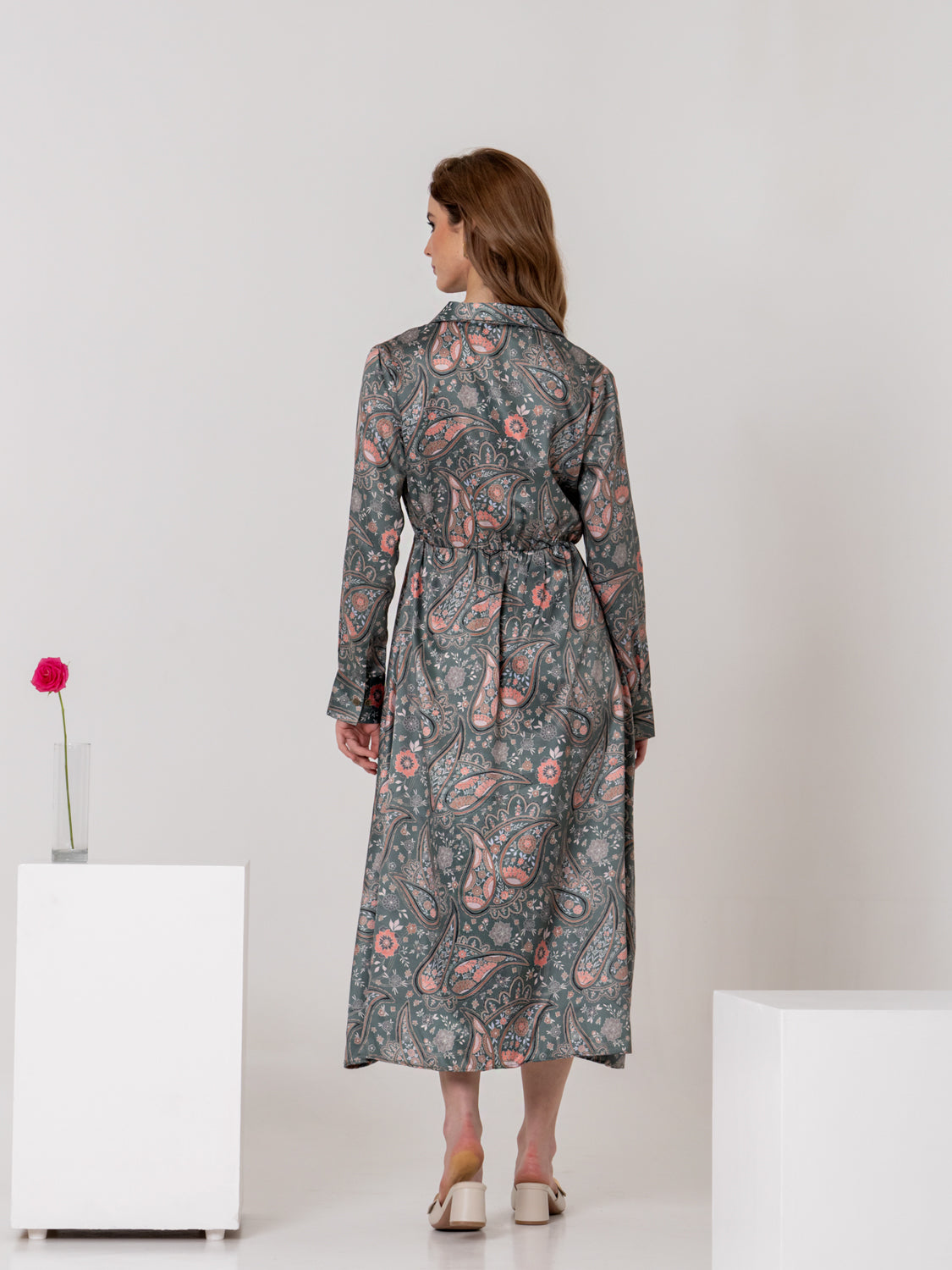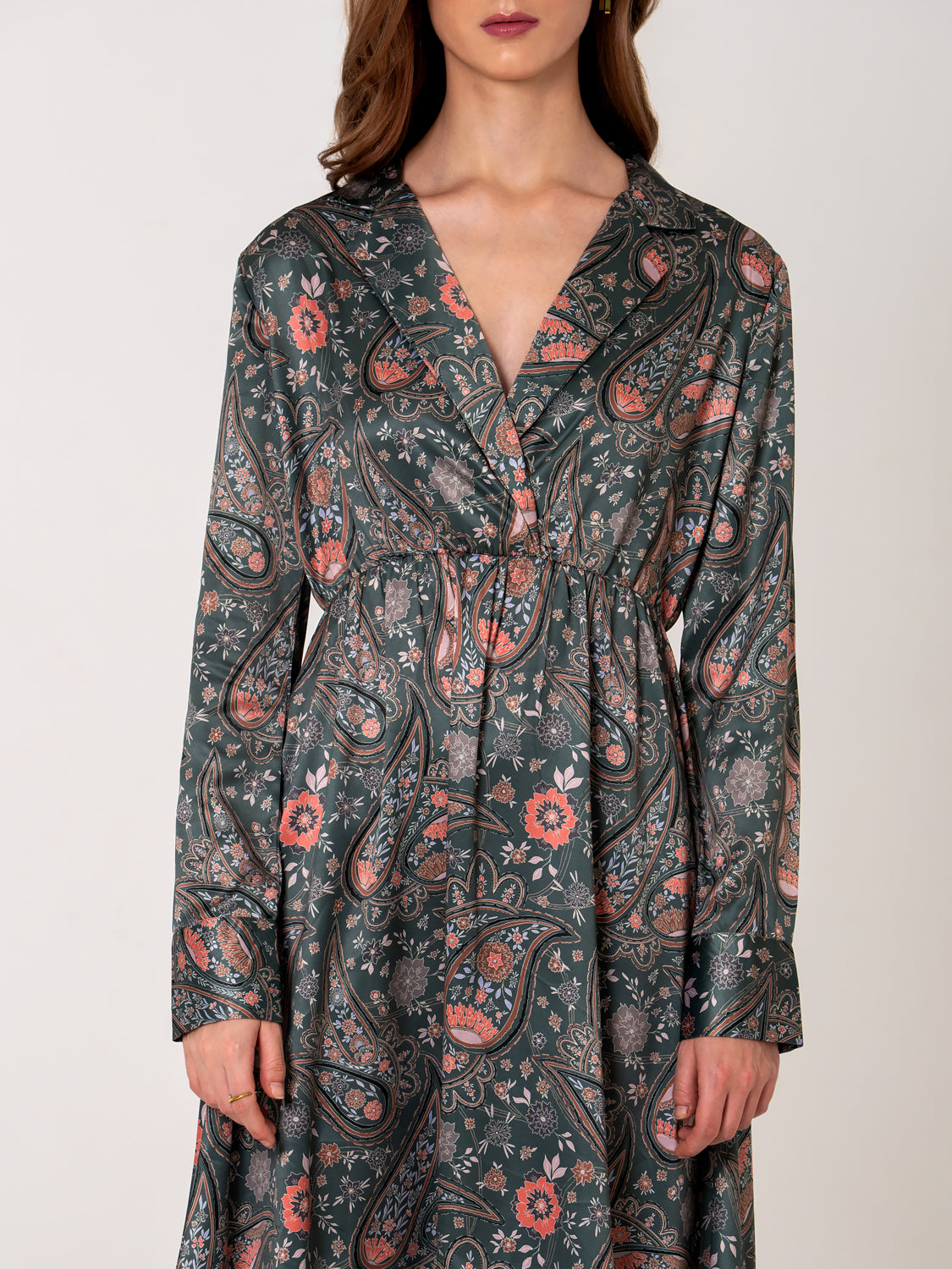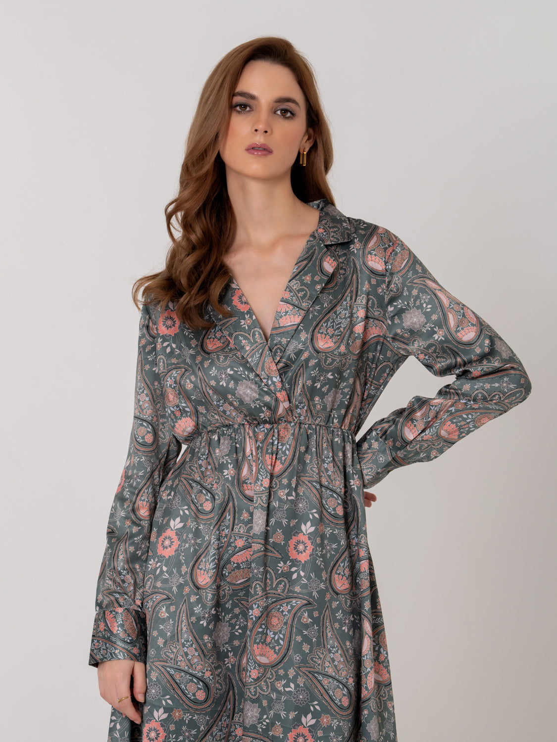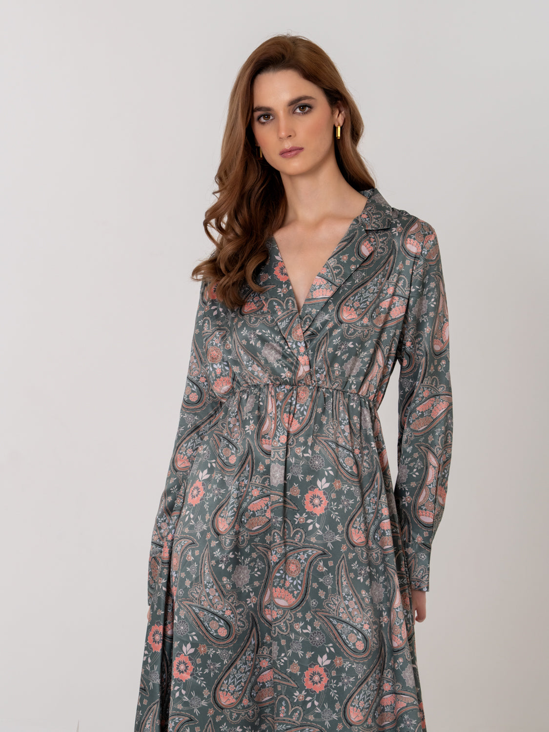 This elegant slip-on dress features a V-neck lapel collar, and long sleeves with buttoned cuffs. An elasticated waist cinches the garment for a comfortable.
