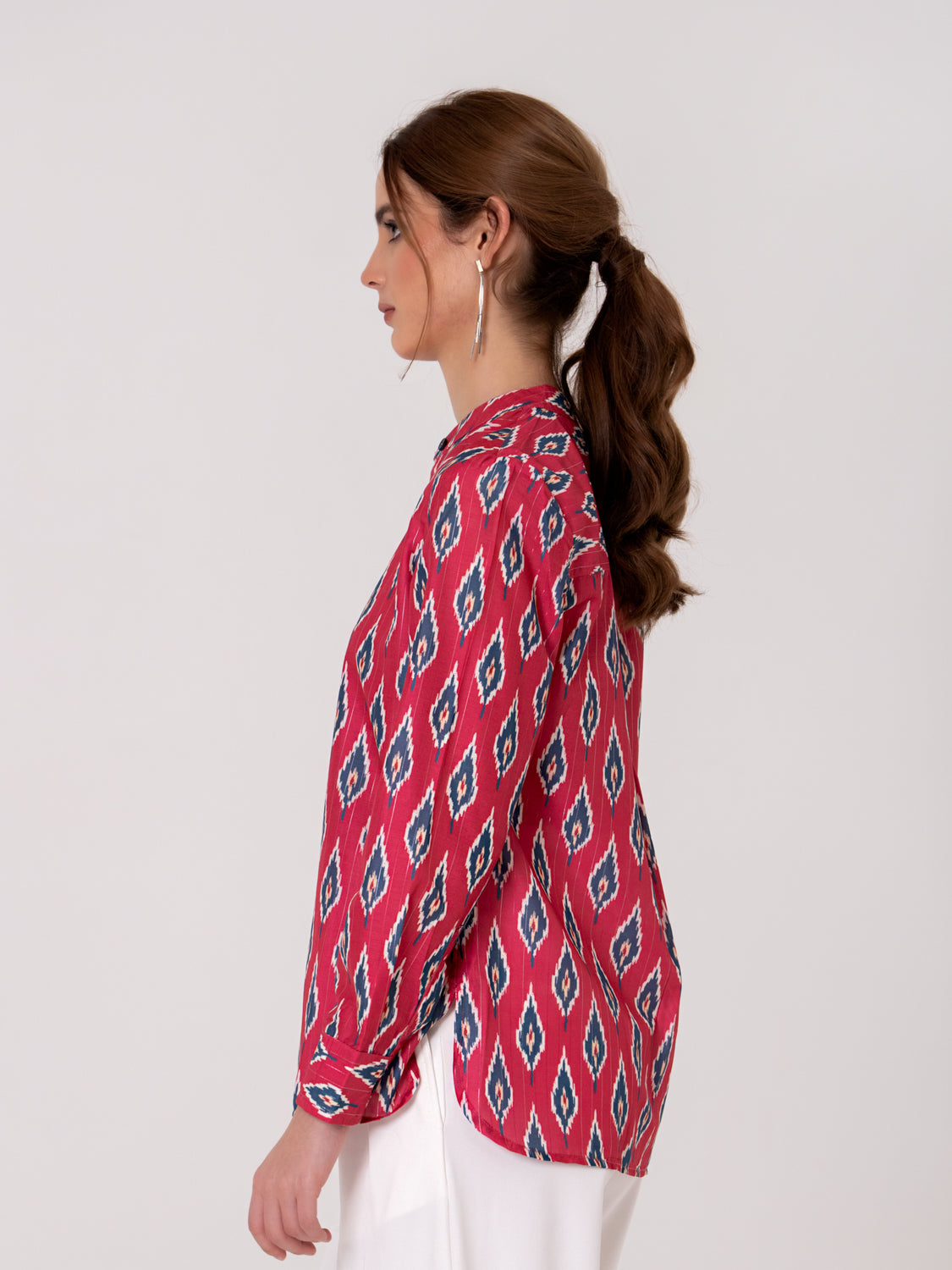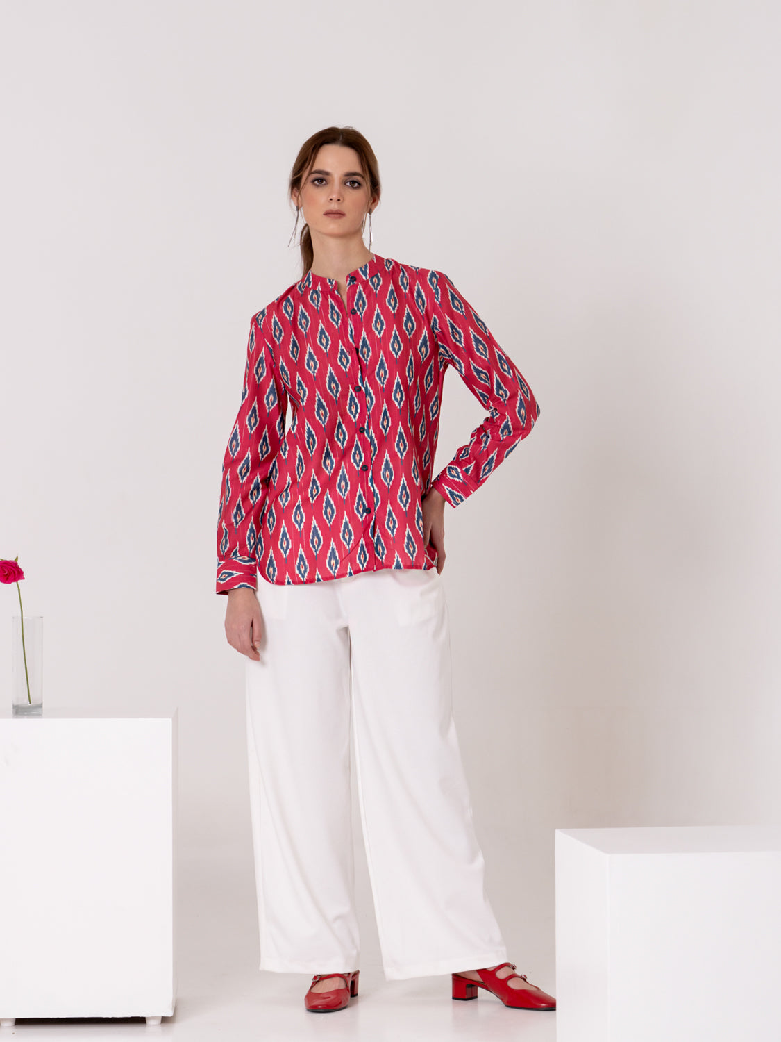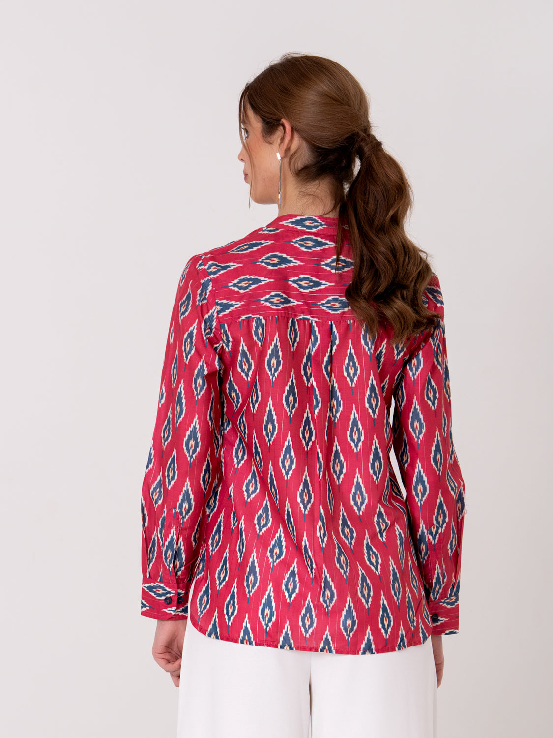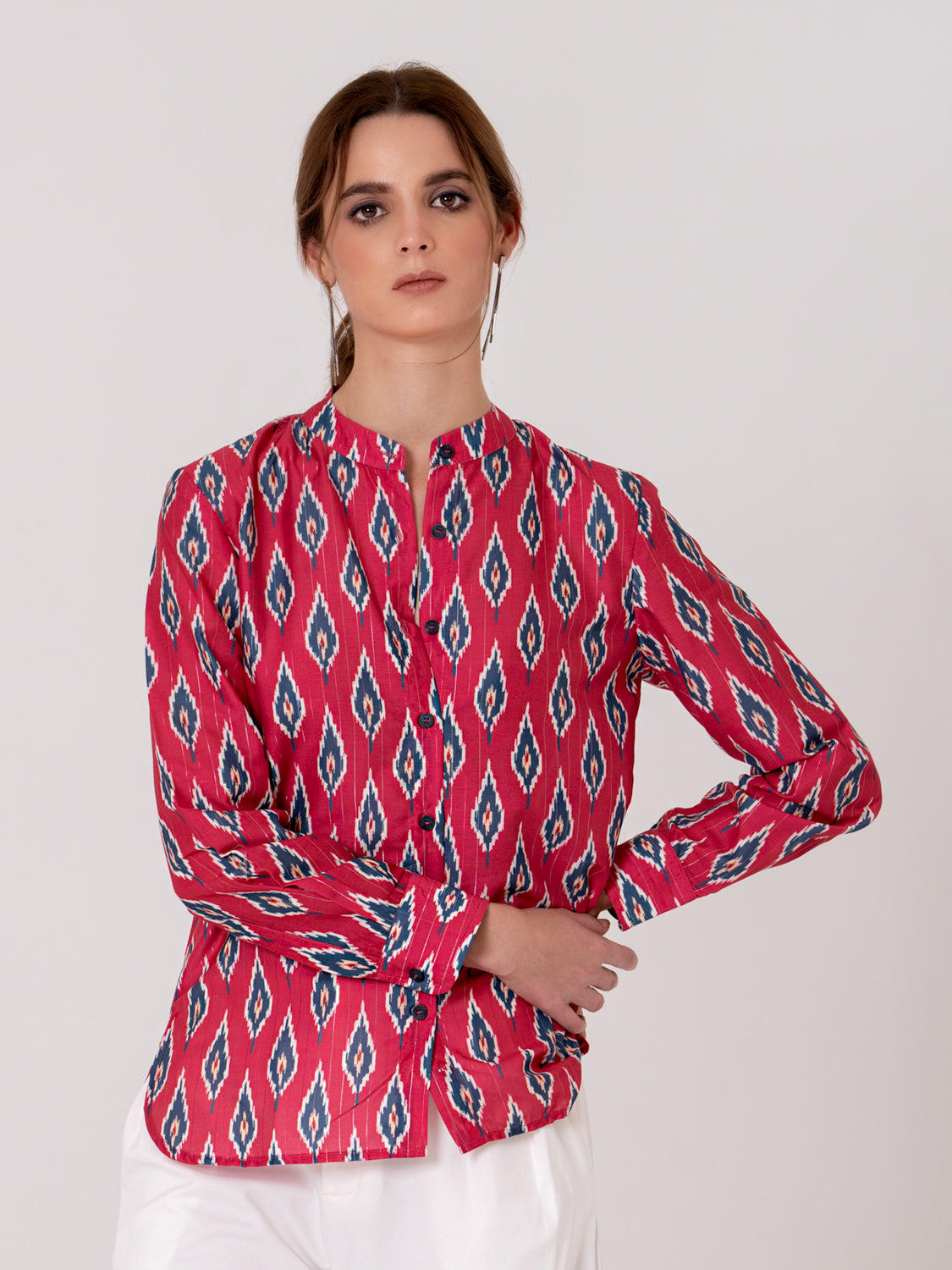 This distinctive long-sleeve shirt features a mandarin collar, full button placket and neatly buttoned cuffs.