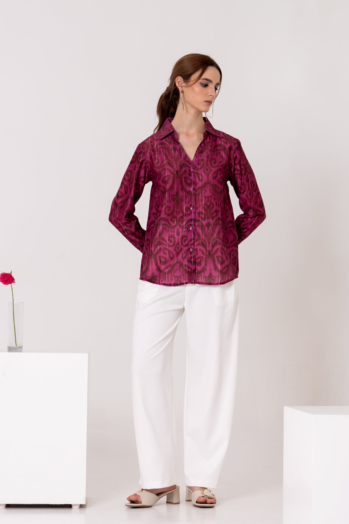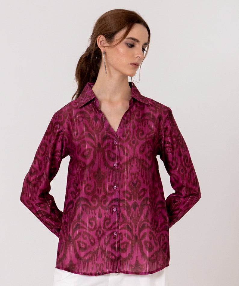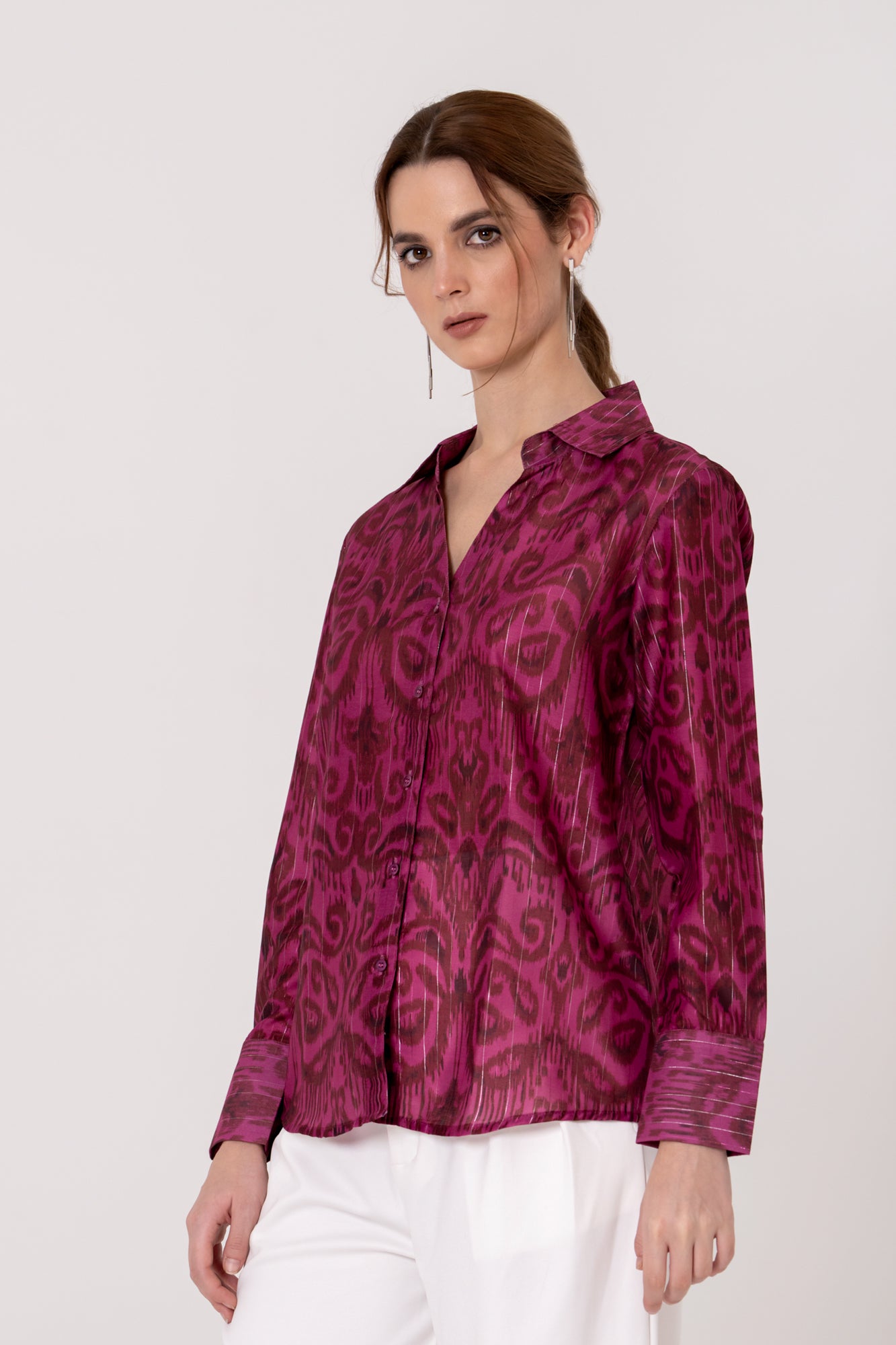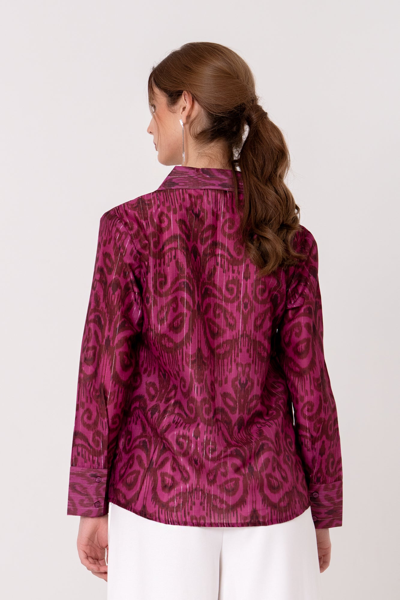 This long-sleeved button-up shirt features a notched collar that forms a flattering V-neck when buttoned. It includes buttoned cuffs and falling to a standard hip length.
