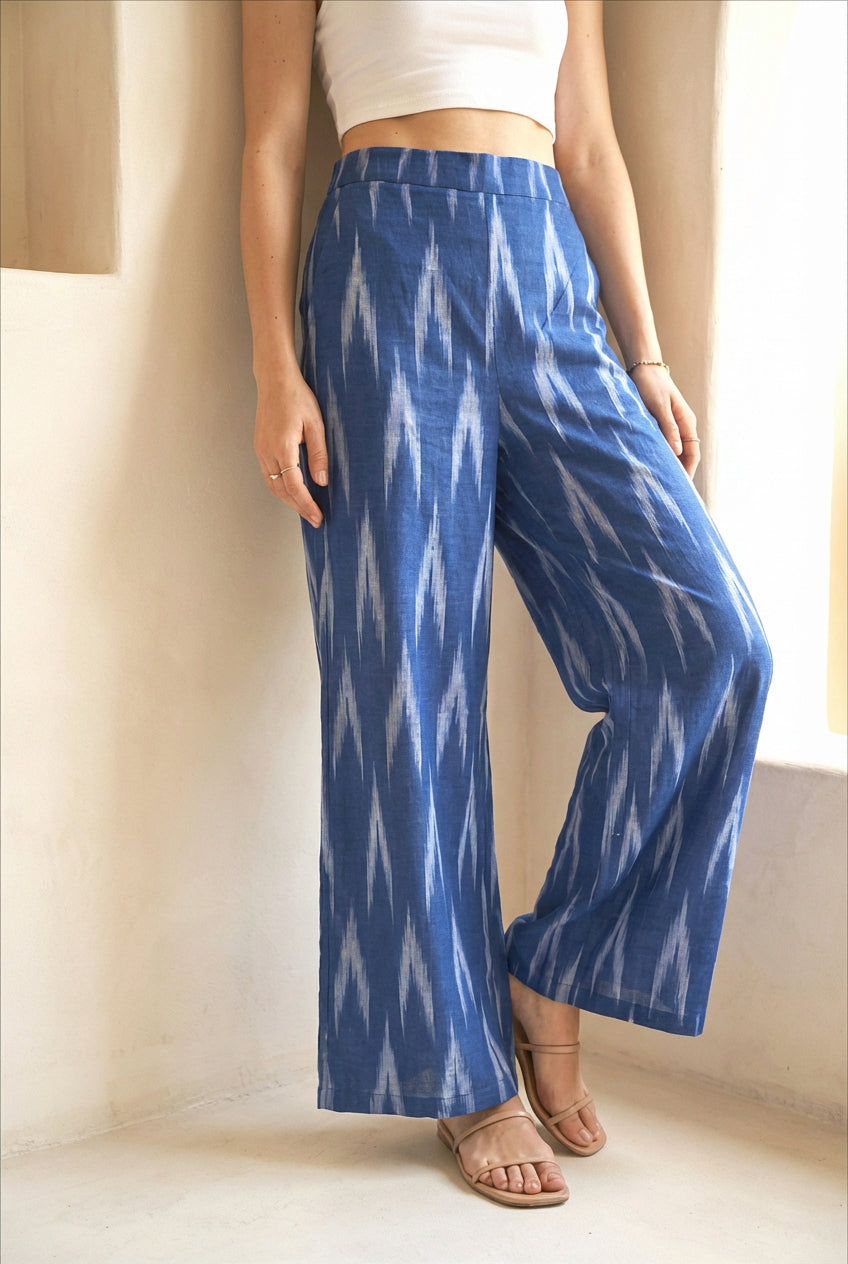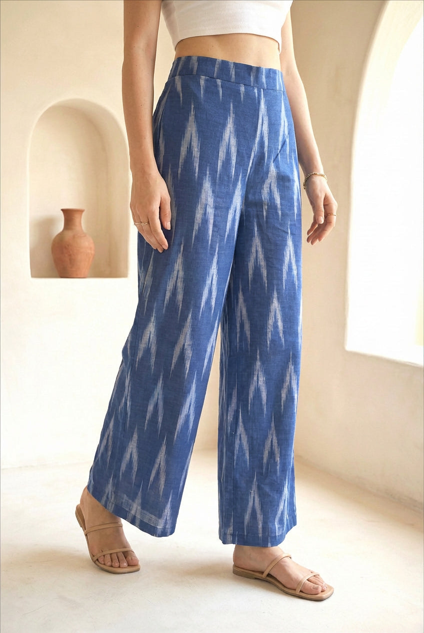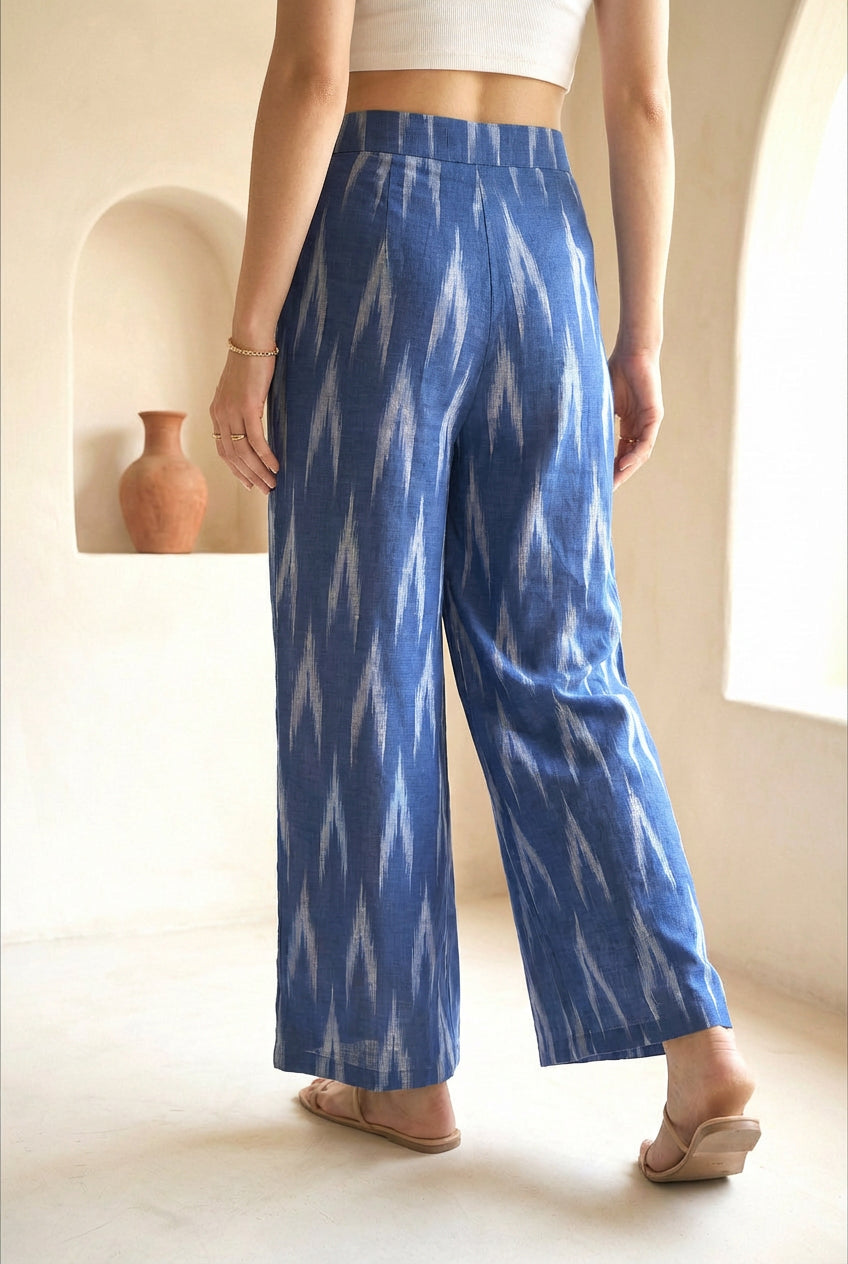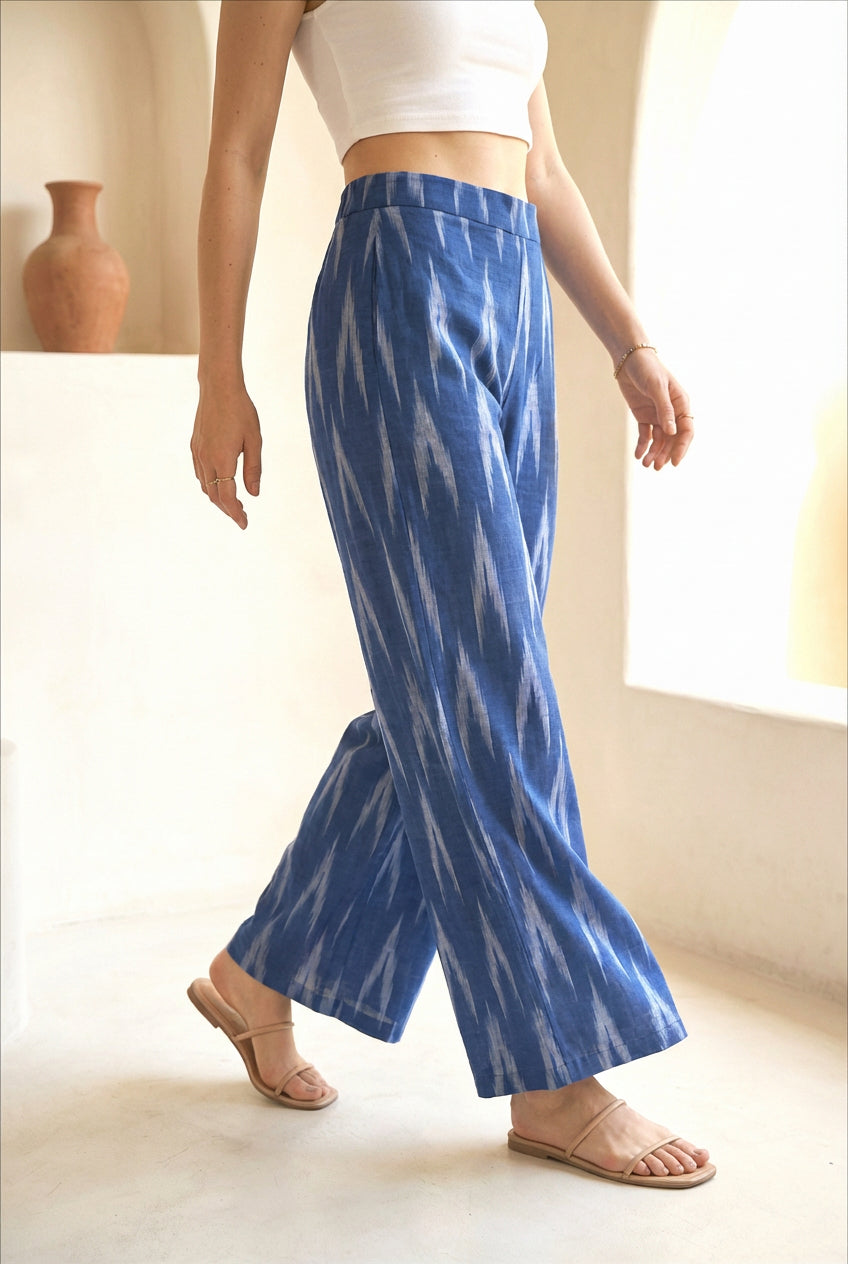 Straight-fit pants in indigo blue, designed with a clean hook-and-zipper closure for a sharp, tailored feel. The silhouette stays structured yet comfortable, making it easy to style for both everyday wear and elevated looks. This versatile piece pairs effortlessly with both printed and solid tops.
