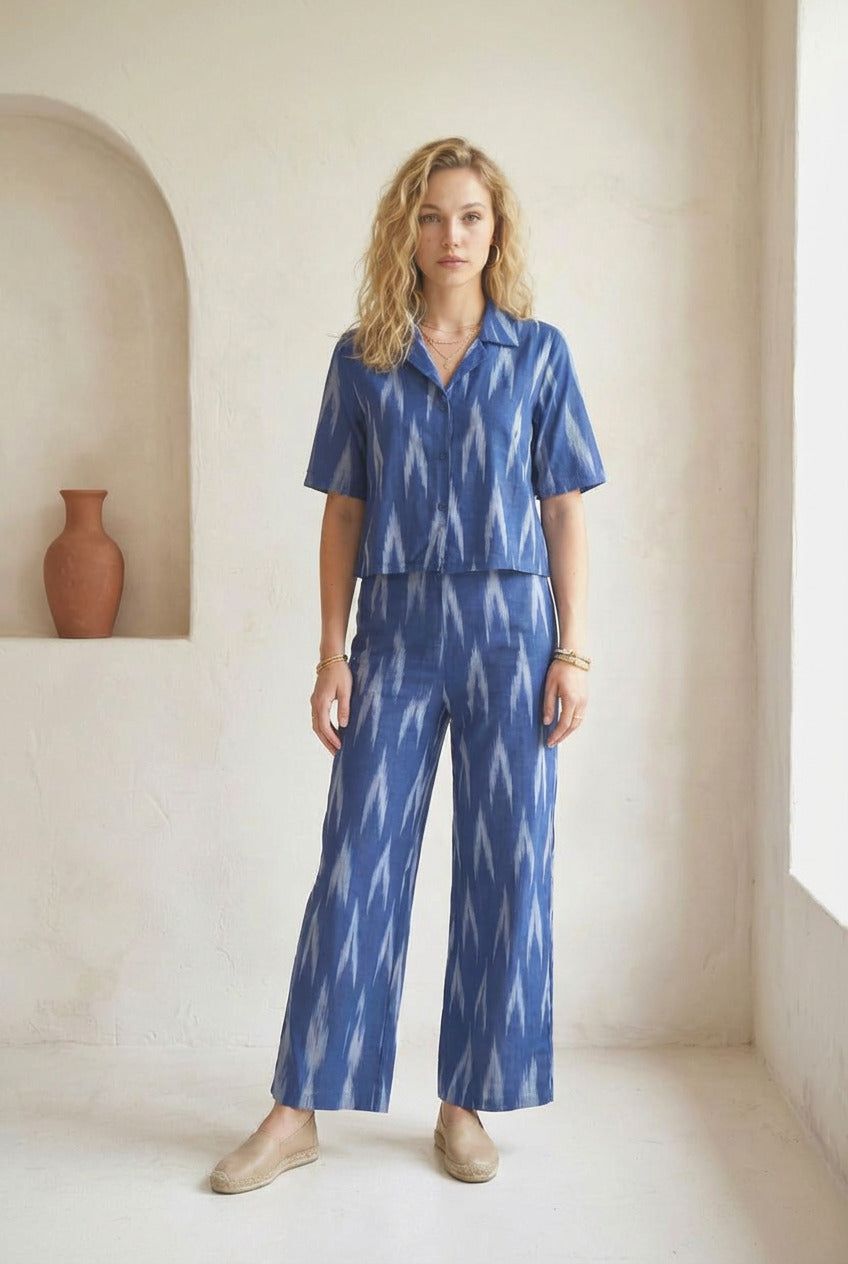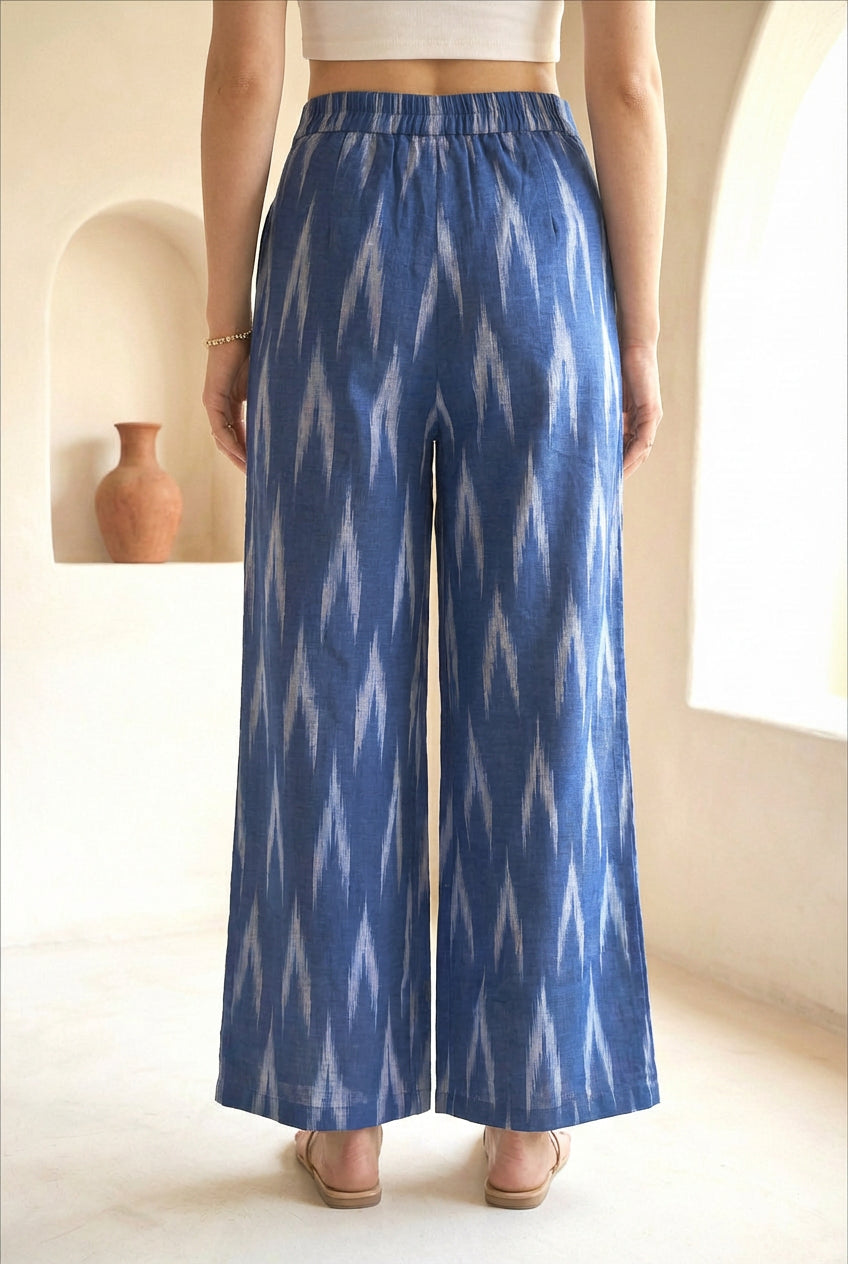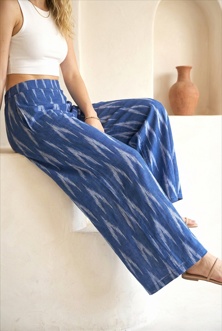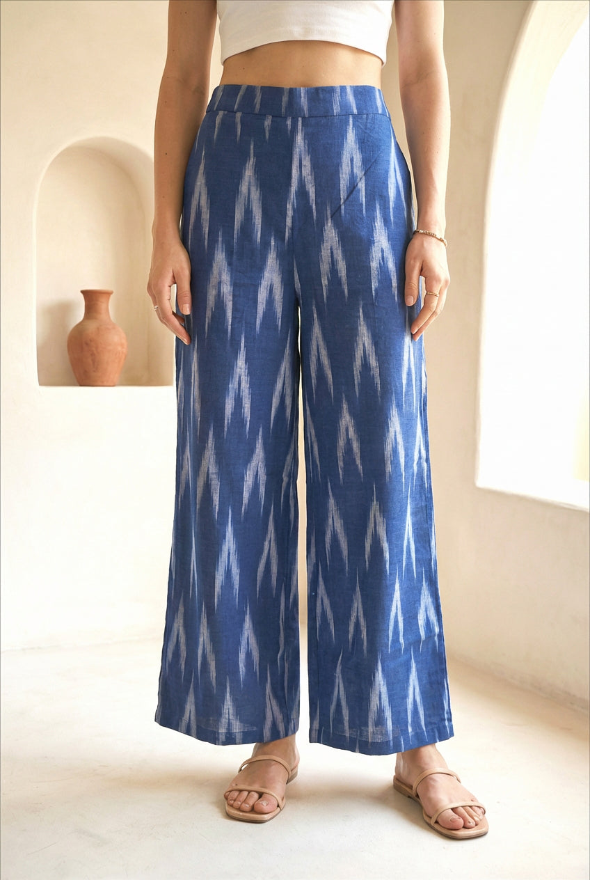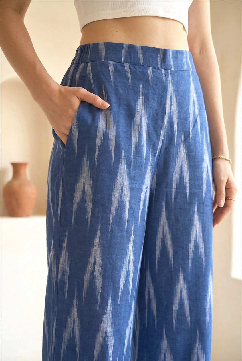 Straight-fit pants in indigo blue, designed with a clean hook-and-zipper closure for a sharp, tailored feel. The silhouette stays structured yet comfortable, making it easy to style for both everyday wear and elevated looks. This versatile piece pairs effortlessly with both printed and solid tops.