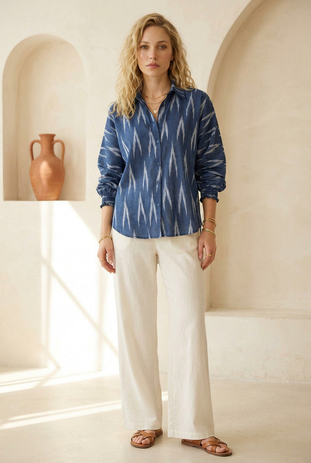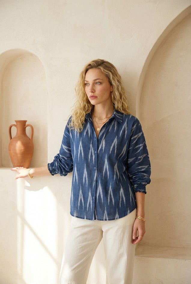 Indigo blue ikat shirt with a collared neckline and button-down front. Designed in a relaxed regular fit with full-length sleeves and elasticated cuffs for easy movement. Ideal for everyday wear with a refined edge.