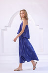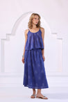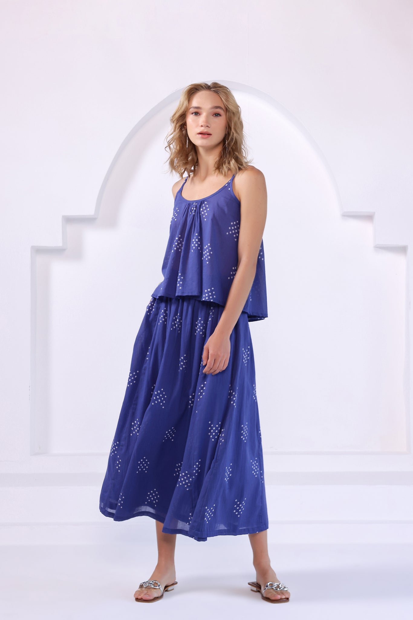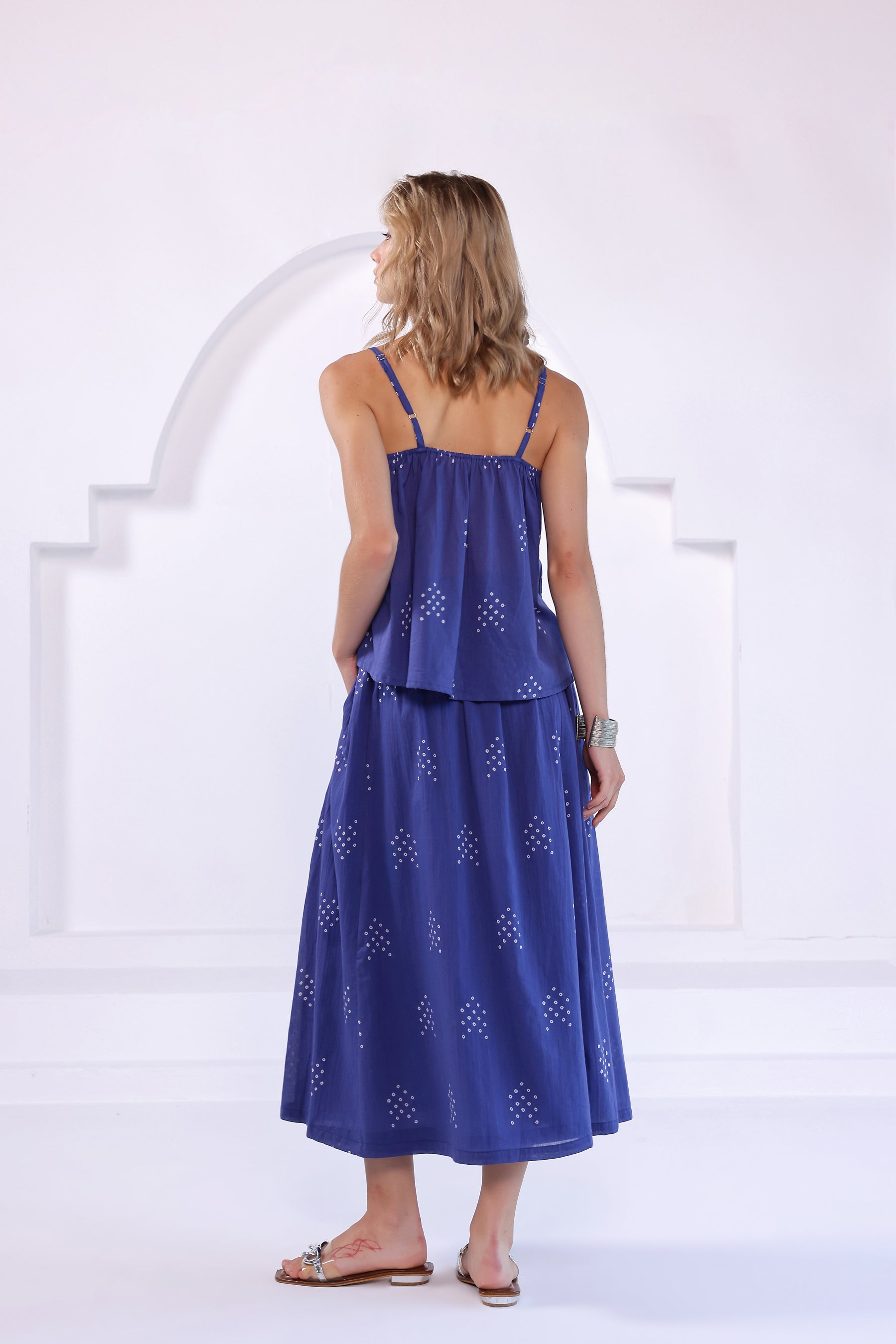 Bandhani printed top in cotton fabric with gather details around the neck. Adjustable shoulder straps and elasticated back. Mid-length skirt with panels and elasticated waist.