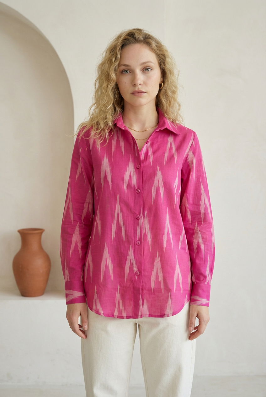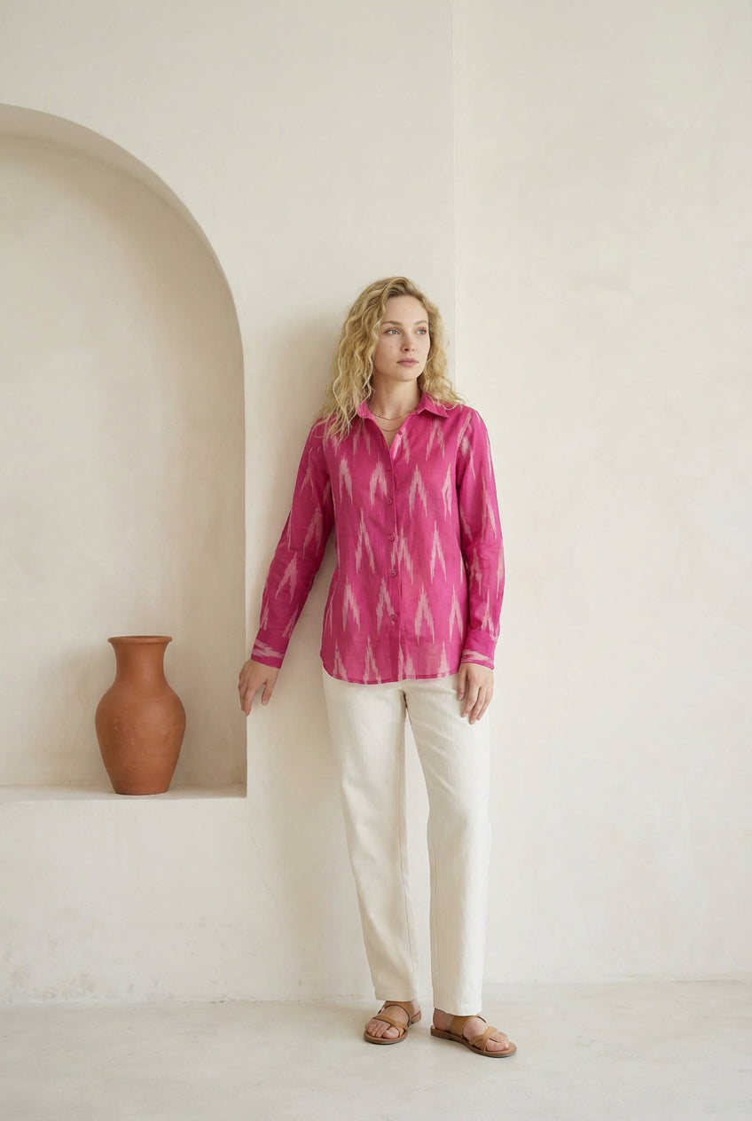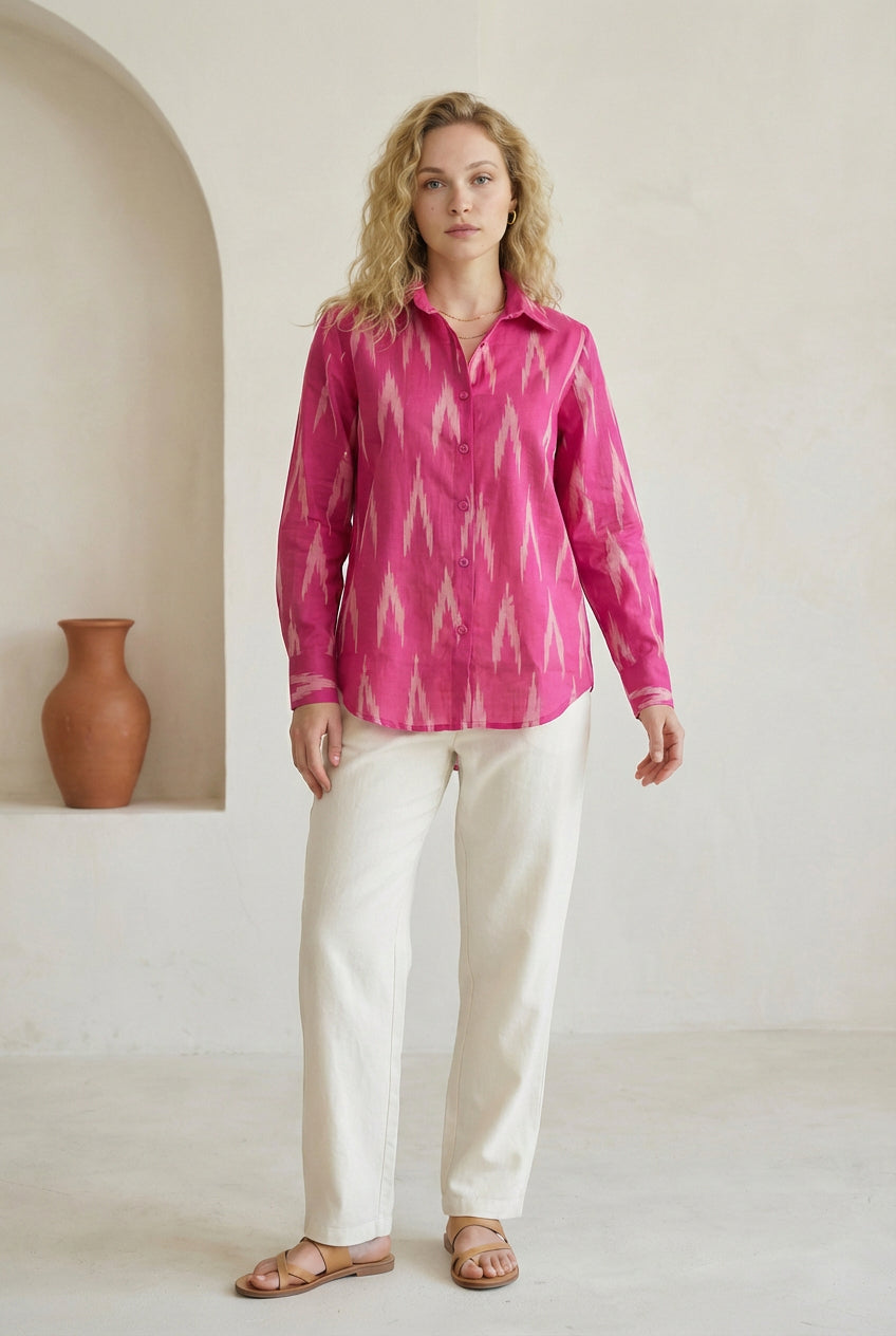Berry pink ikat shirt with a classic button-down front and straight silhouette. Designed with full sleeves, a pointed collar, and soft structure for everyday ease. Easy to dress up or down, depending on your mood.