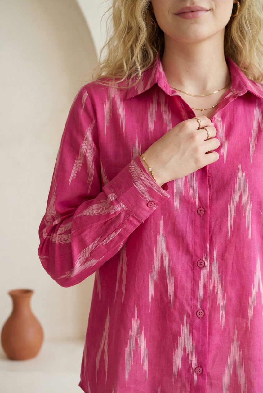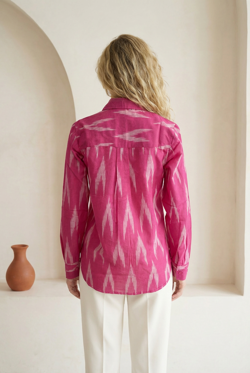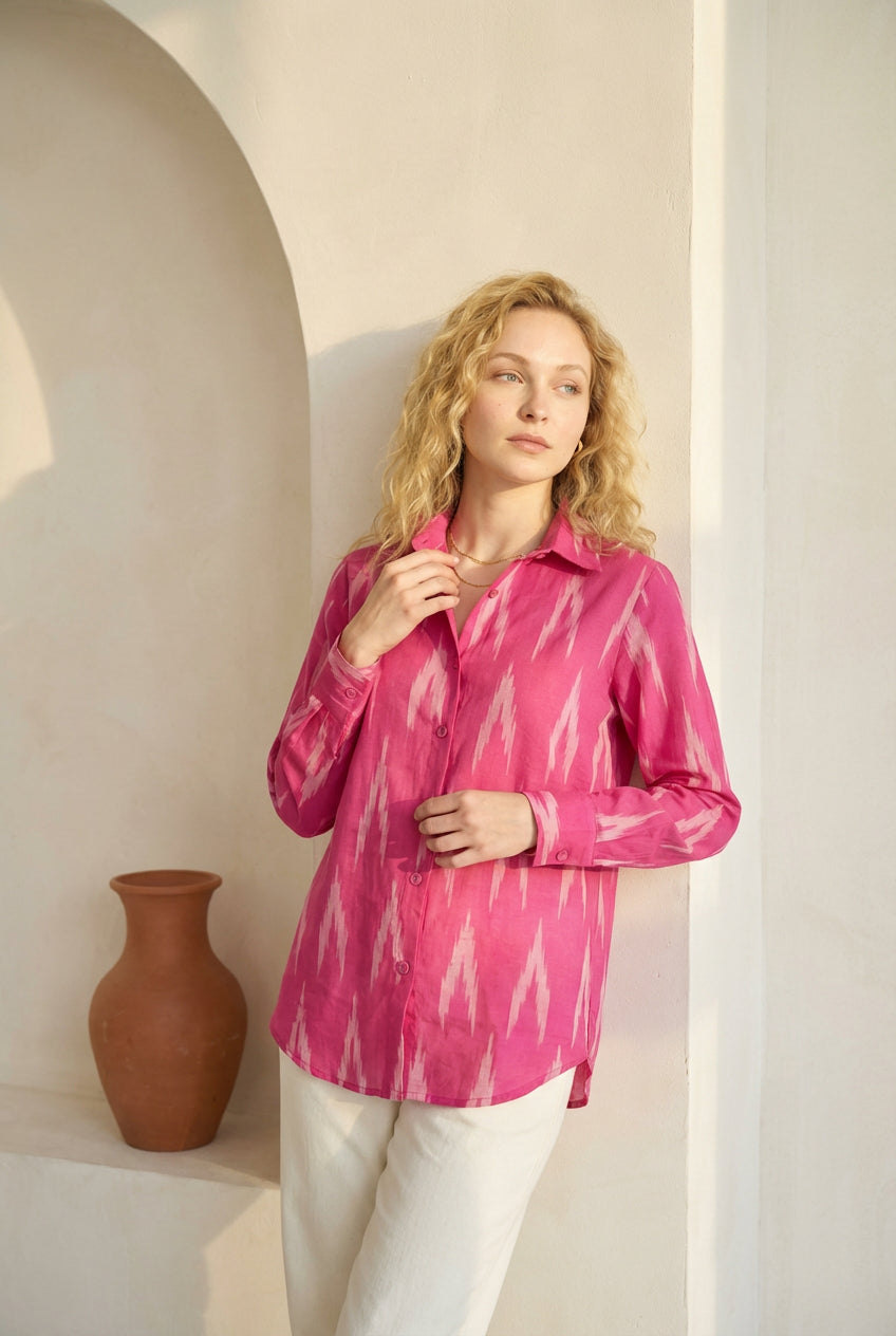 Berry pink ikat shirt with a classic button-down front and straight silhouette. Designed with full sleeves, a pointed collar, and soft structure for everyday ease. Easy to dress up or down, depending on your mood.