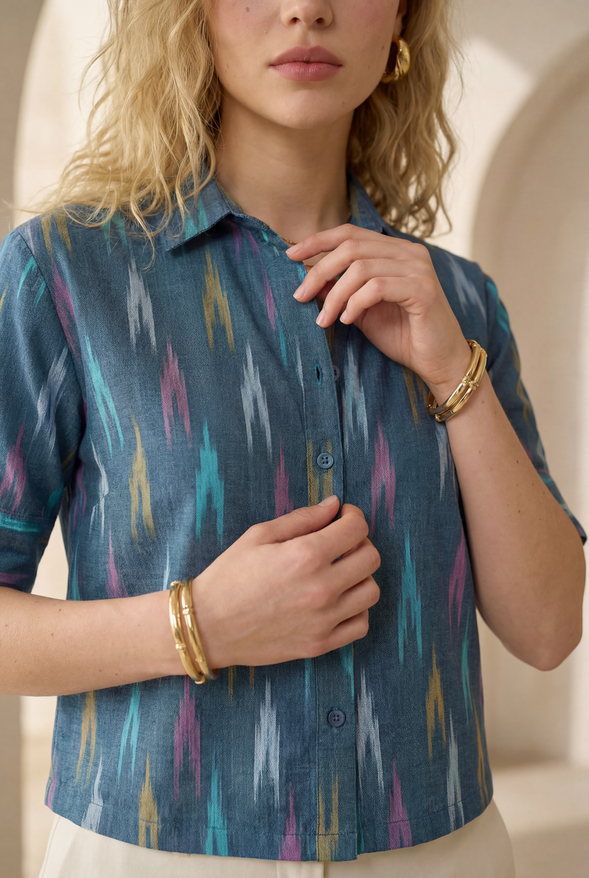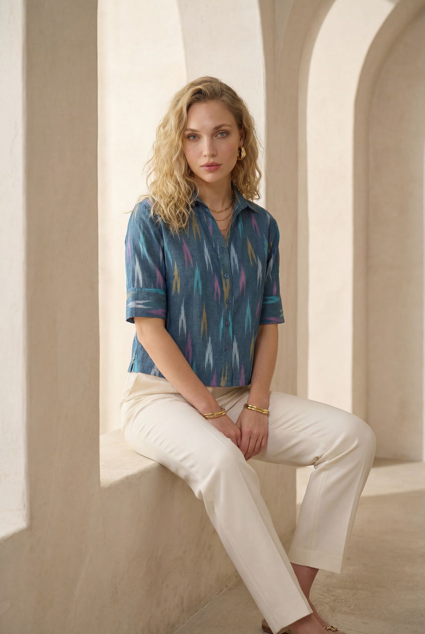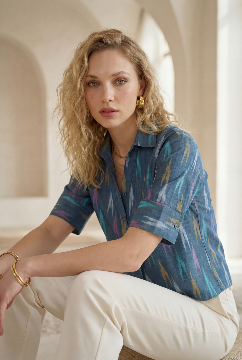 Blue Mirage Ikat Three-Quarter Sleeve Shirt