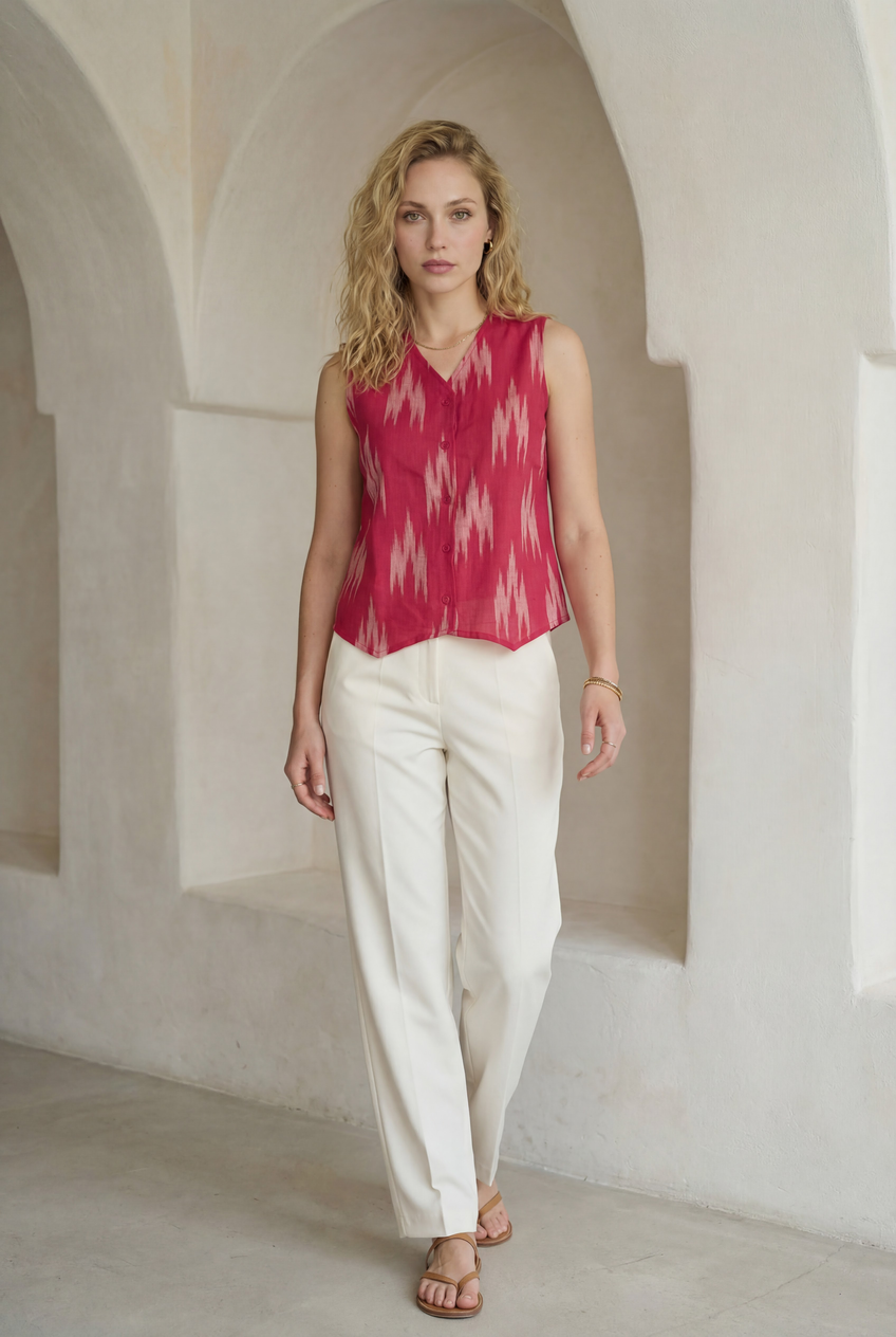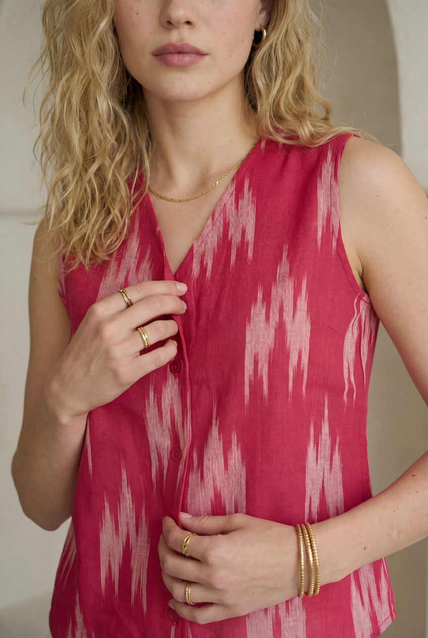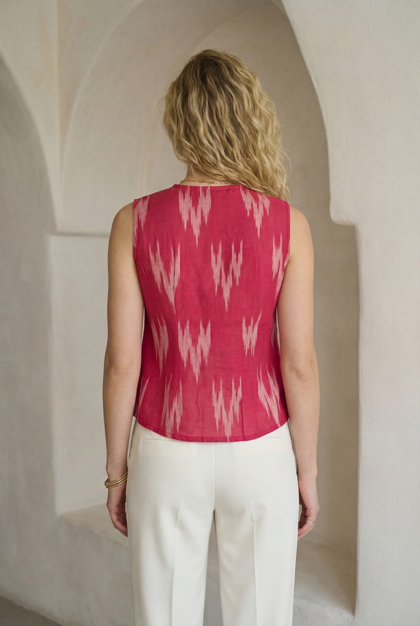 Fuchsia pink ikat sleeveless top with a V-neckline and button-down front. Designed in a straight fit with a softly pointed hem that adds structure without feeling stiff. An easy pick for warm days and layered looks.
