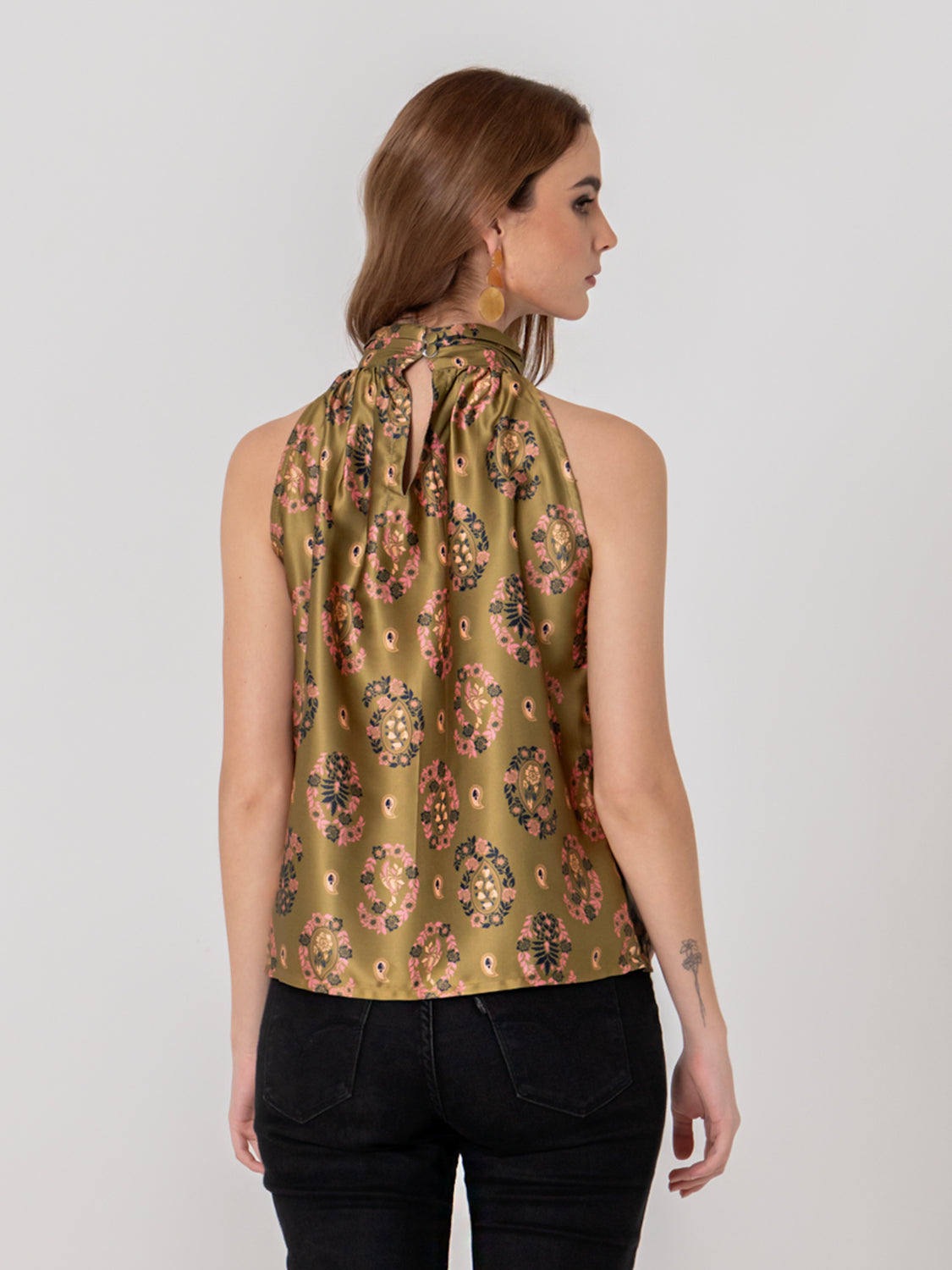 This ensemble pairs a sophisticated high-neck halter top with matching wide-leg trousers.