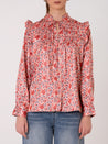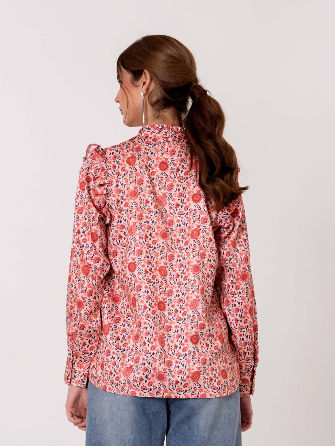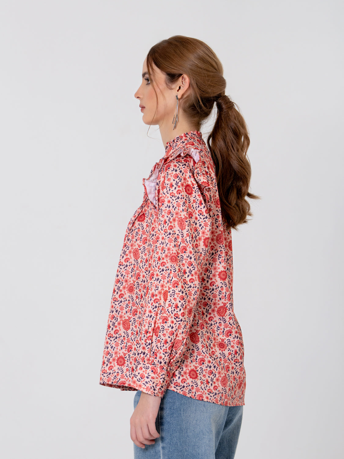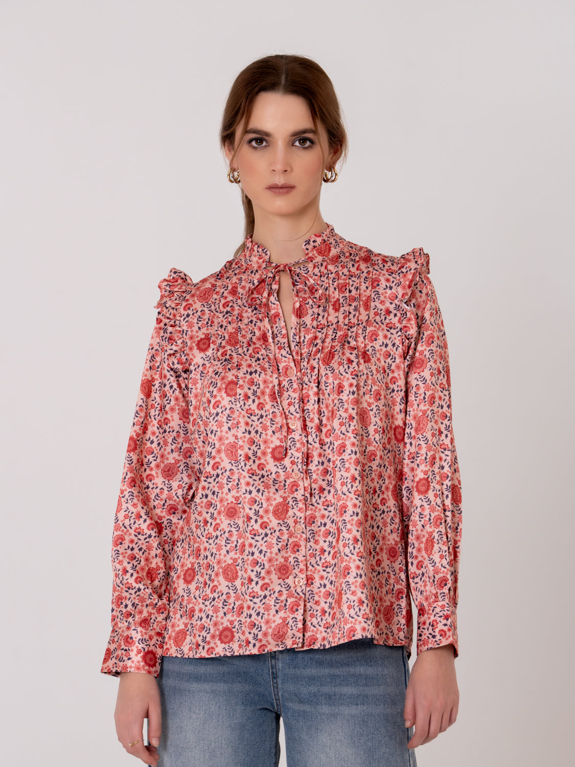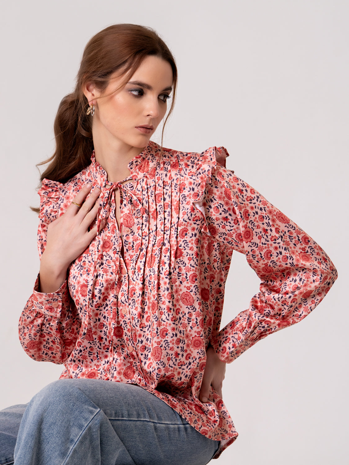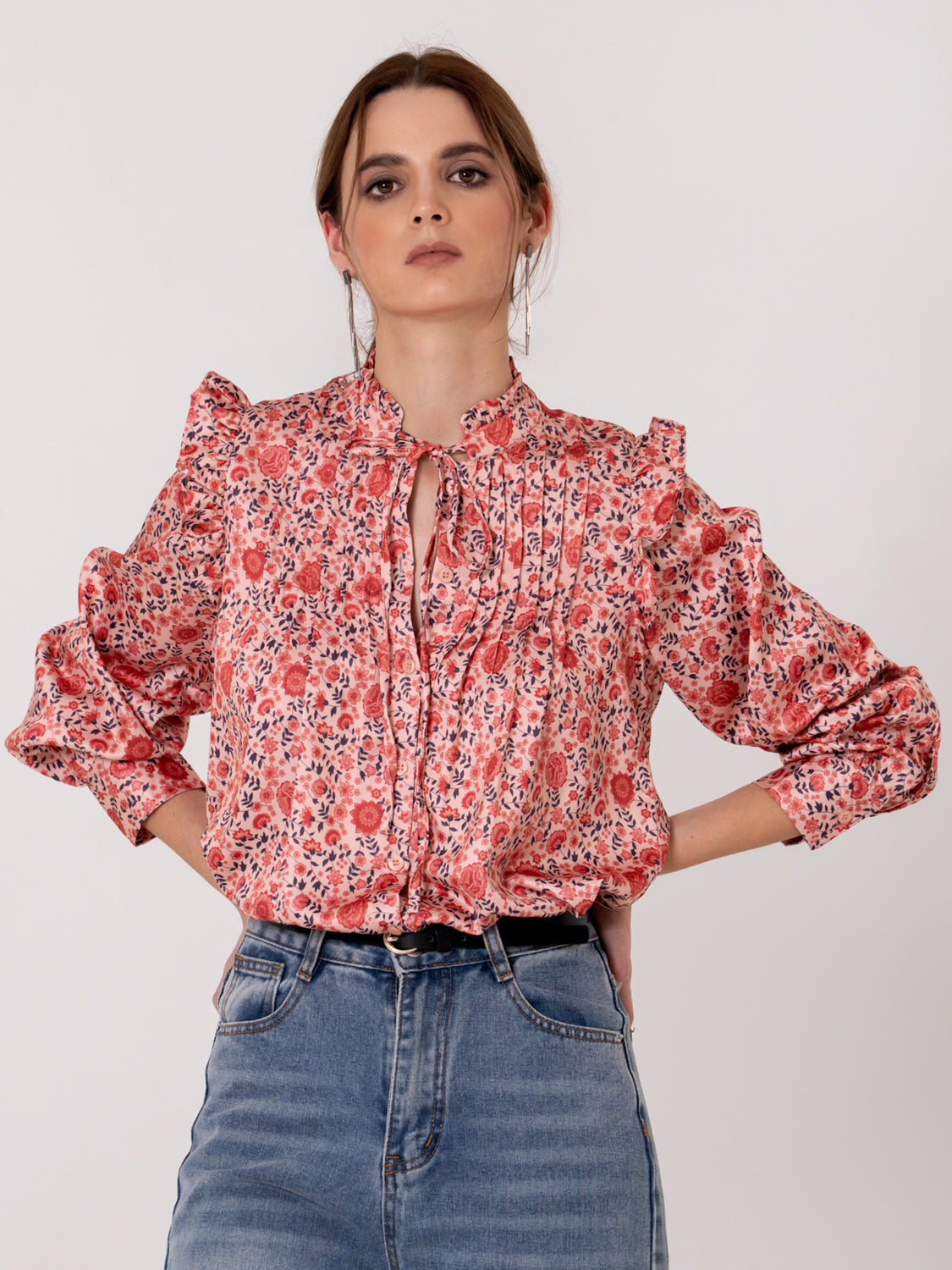 This elegant top features a beige multi-tonal paisley print on satin fabric, with a button-up front, long sleeves, and buttoned cuffs. Details include vertical pintucks and a standing ruffled high neck.