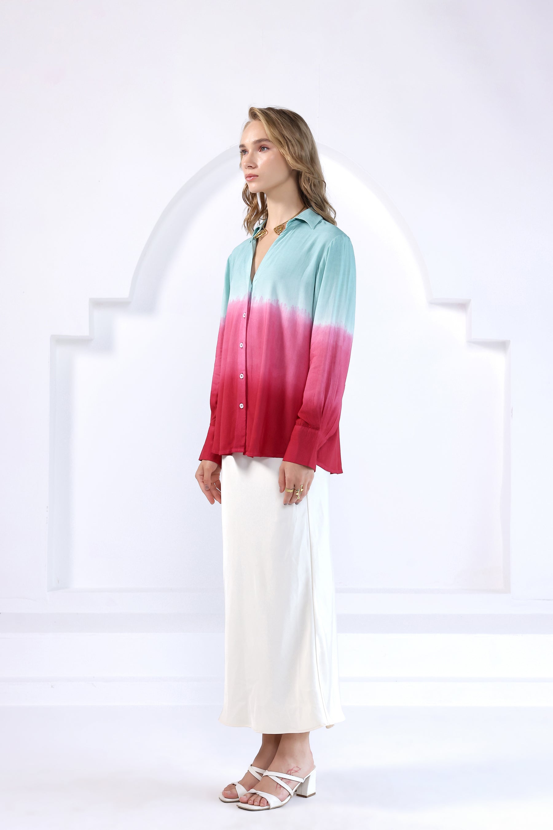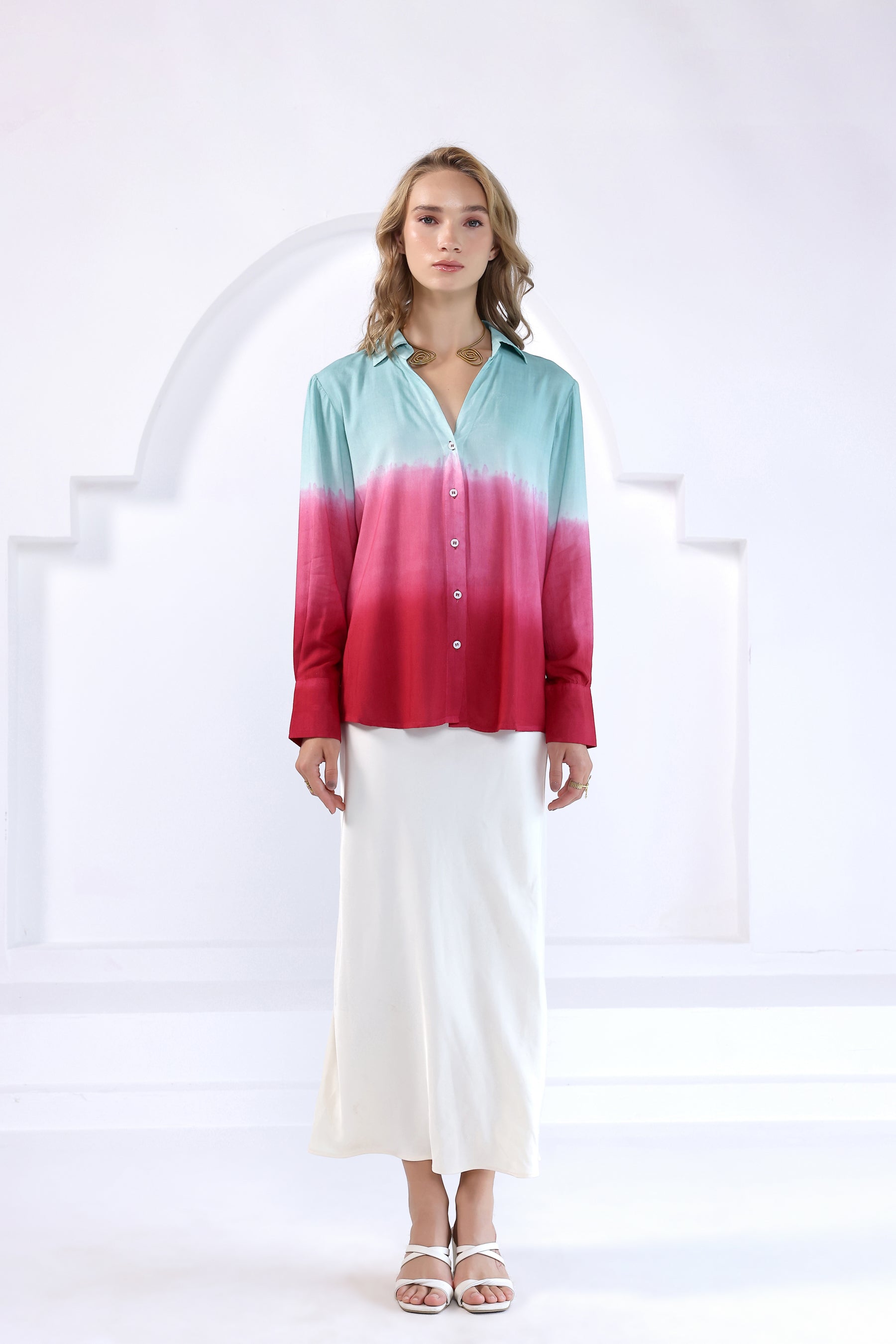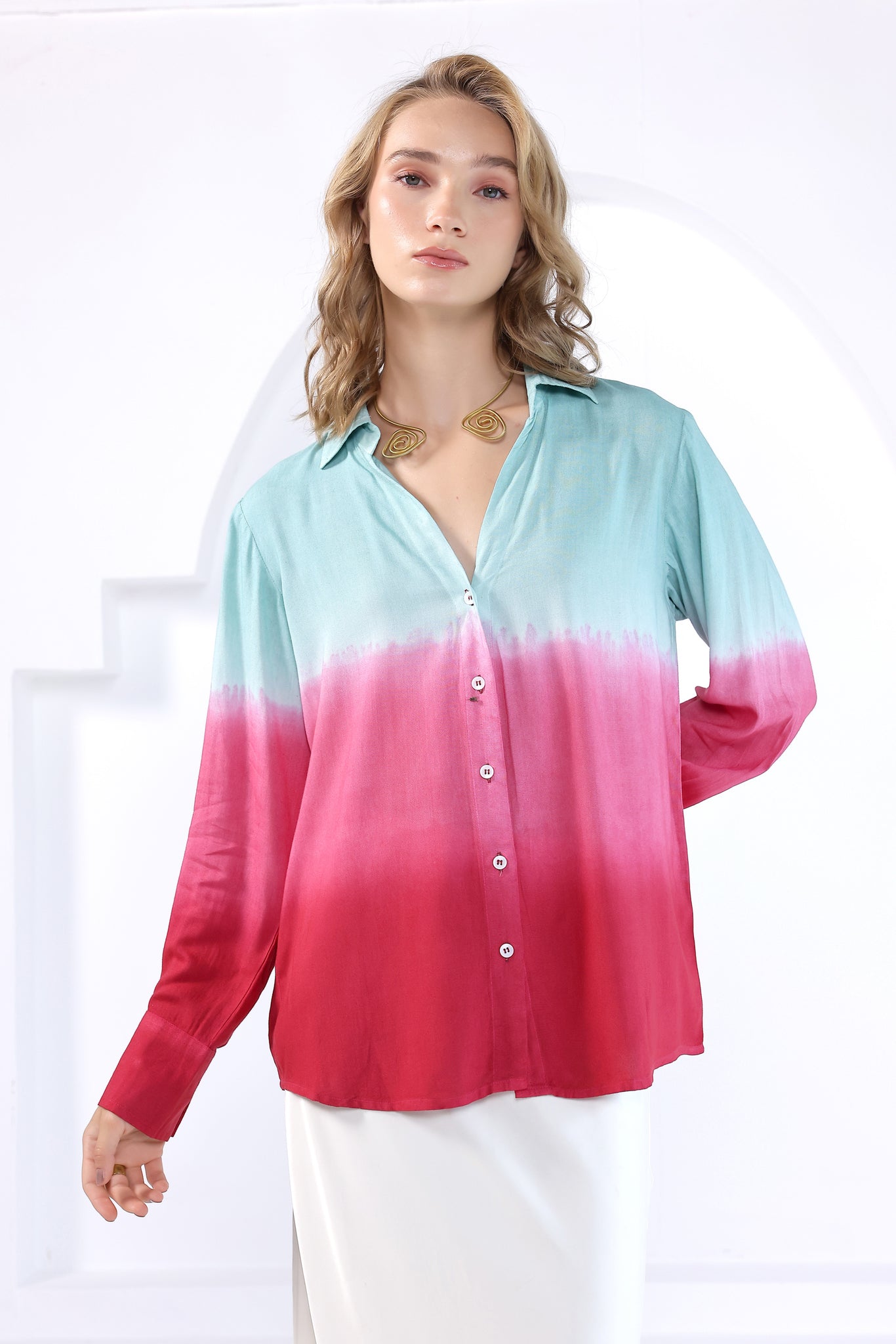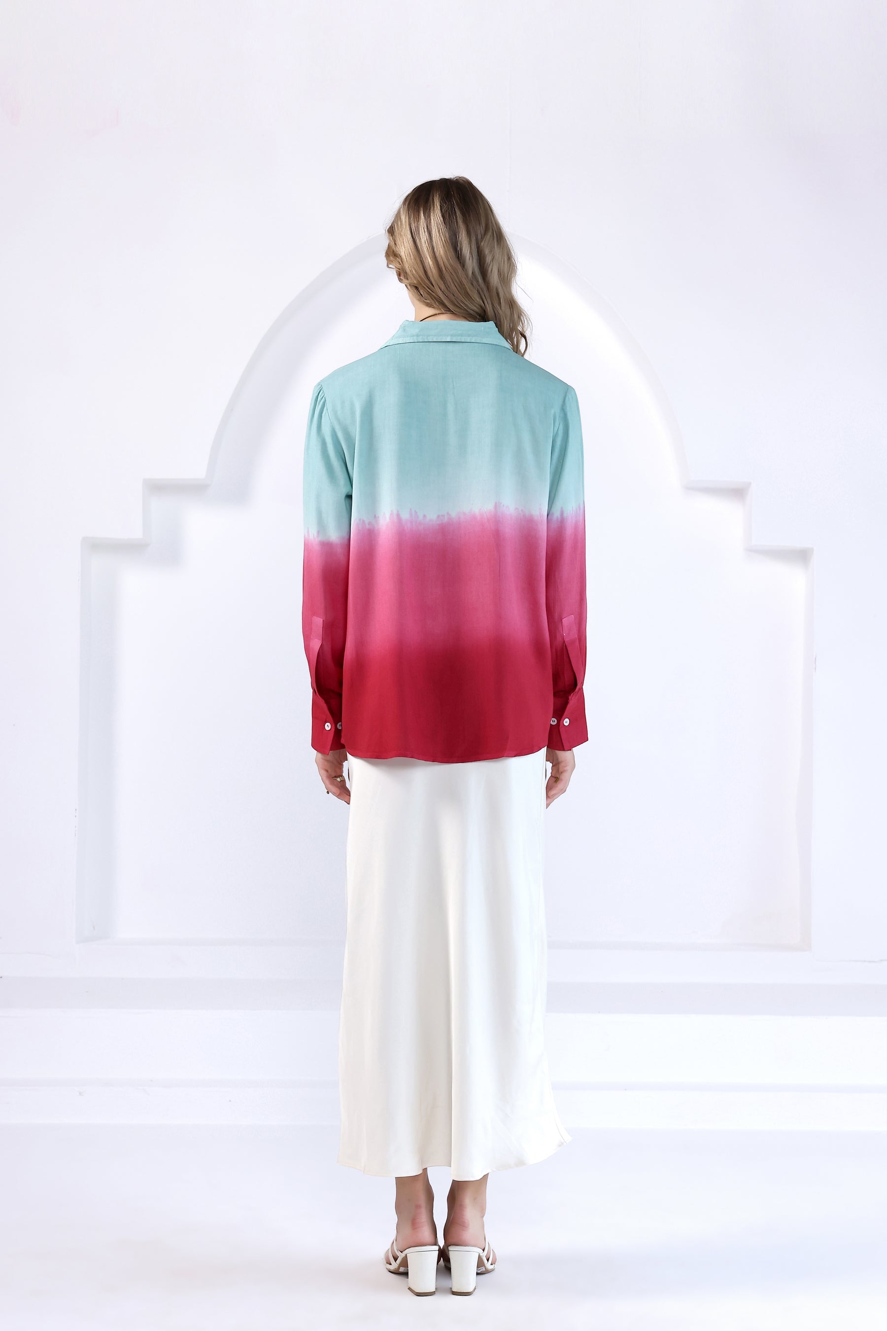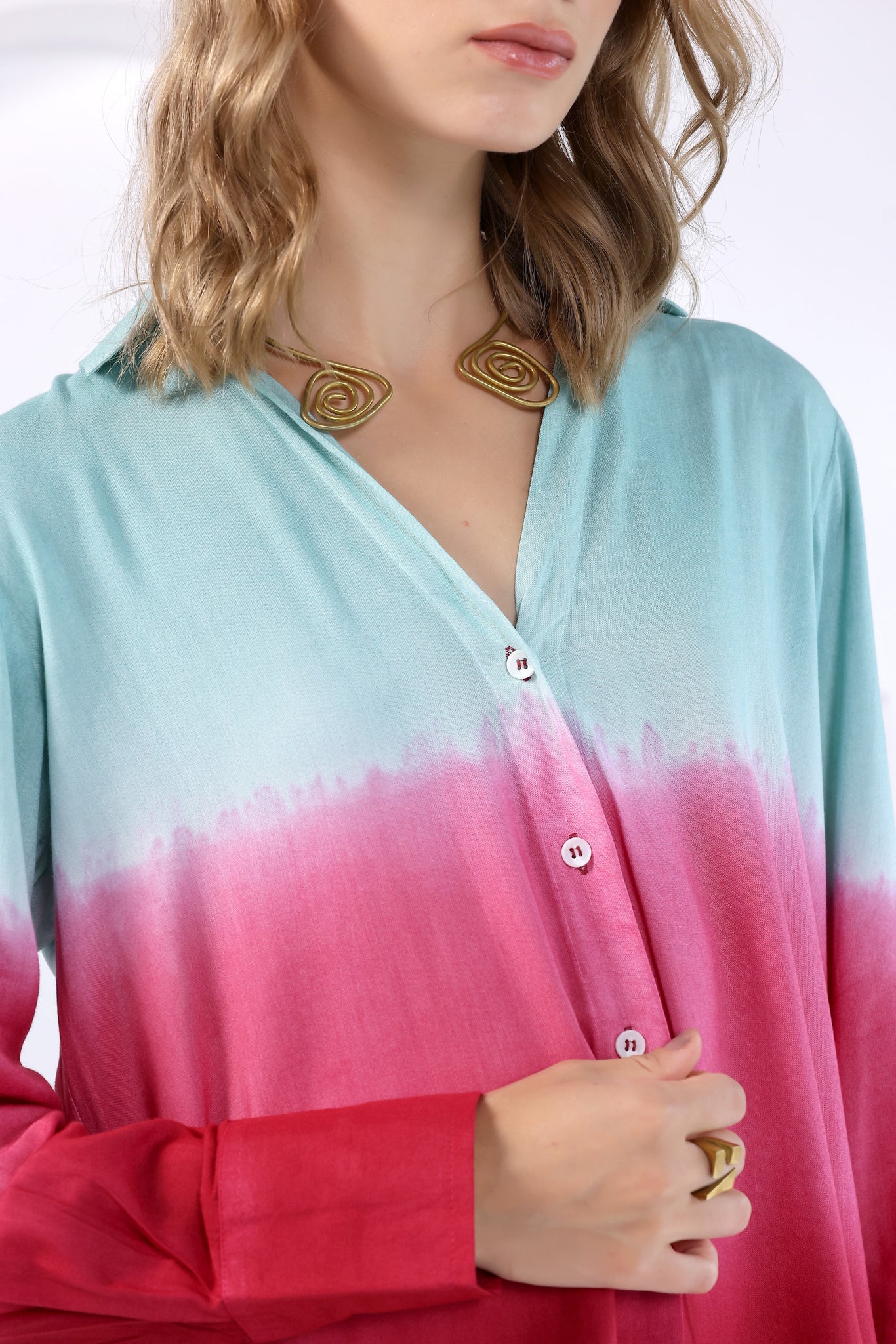 Tie- dye collared v- neck shirt with a button-up front in viscose fabric. Featuring hand- dyed pattern, full sleeves with buttoned cuffs and rounded hem.